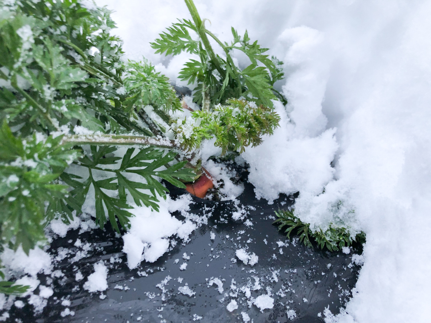 当農園の雪下ニンジンは、農薬を使わず育てております。農薬を使用しませんので、少し形が悪かったり、頭の部分が日焼けや霜、雪にあたり色が変わった物もありますが、問題ありませんので安心して食べてください^ ^