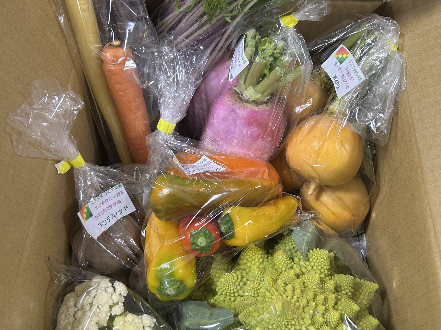 カラフルスティック人参 カラフルミニパプリカぷちぴーmix あやめっ娘ミニ大根 ロマネスコ カリフローレ白 シャキシャキ紫水菜 黄金かぶ カラフルじゃが芋アンデスレッド 柔らかカーリーケール 葉付きスティッキオ その他旬の野菜を予定しています。 紫キャベツ