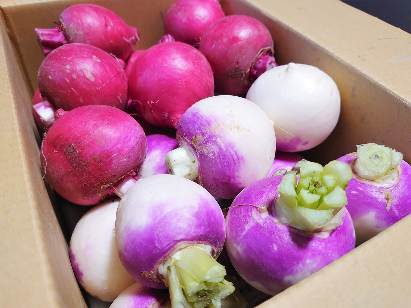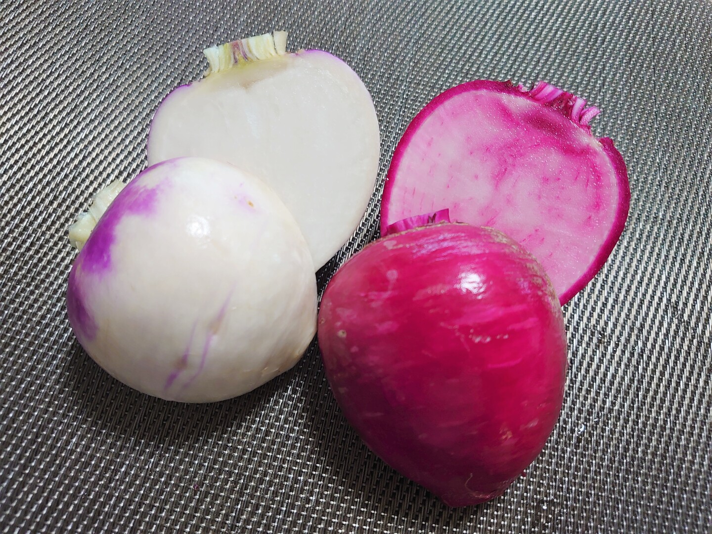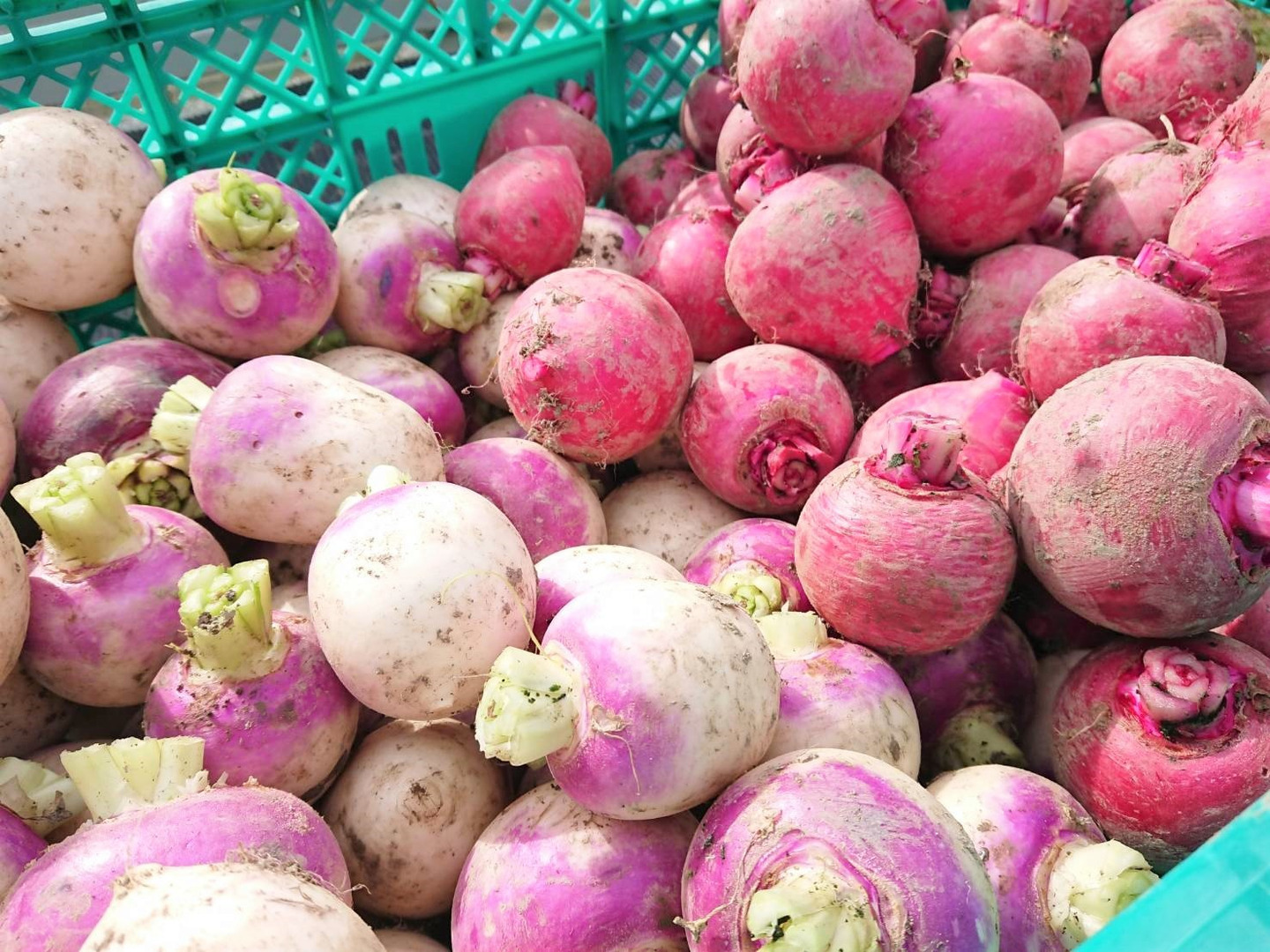 薄い紫色が美しく、中は白いカブ「雪むらさき」です。スープやお鍋、煮ものなど加熱するとトロトロ。