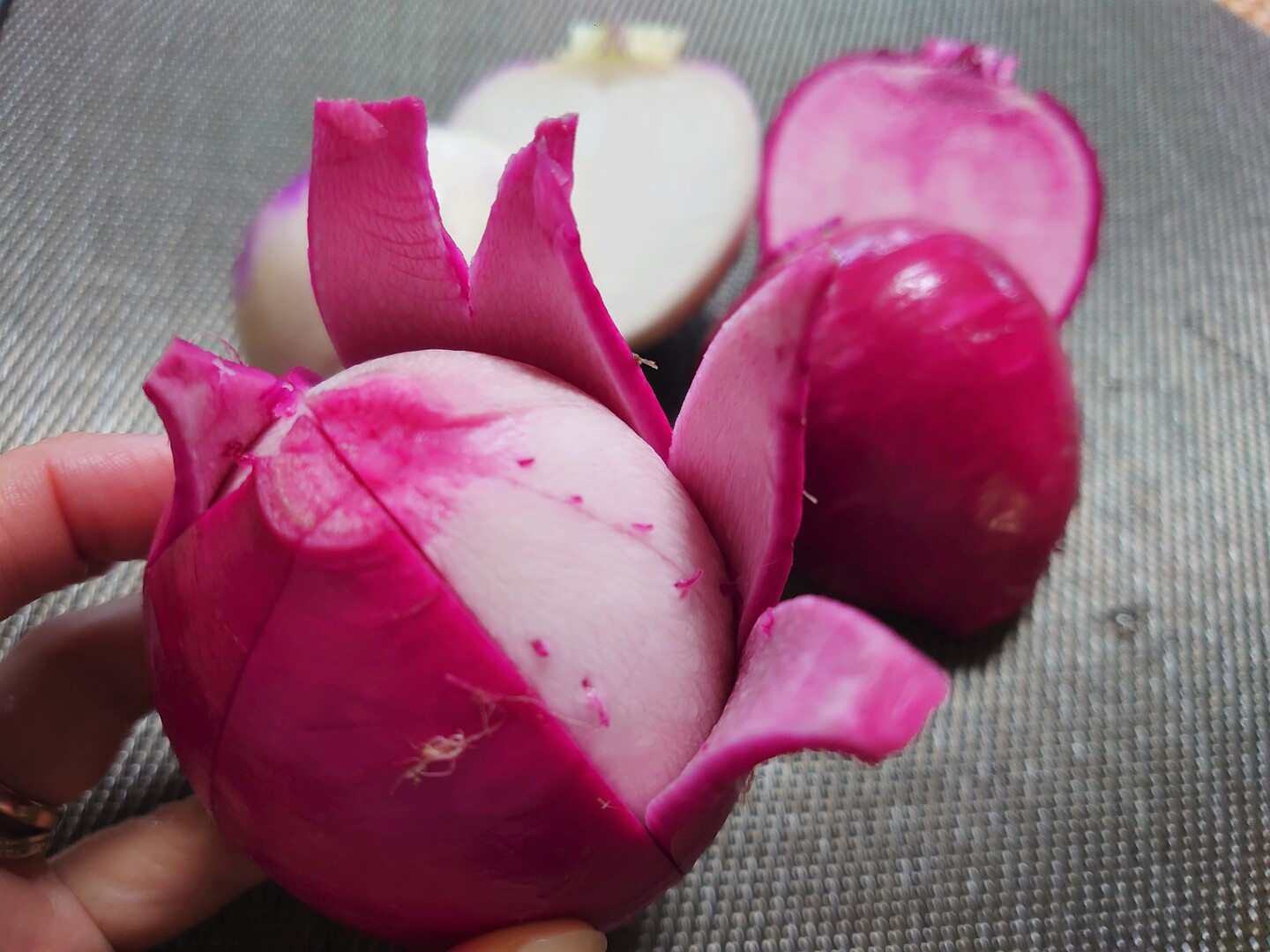 外は赤色ですが、中は白っぽくコントラストがきれいなサラダカブ「もものすけ」です。