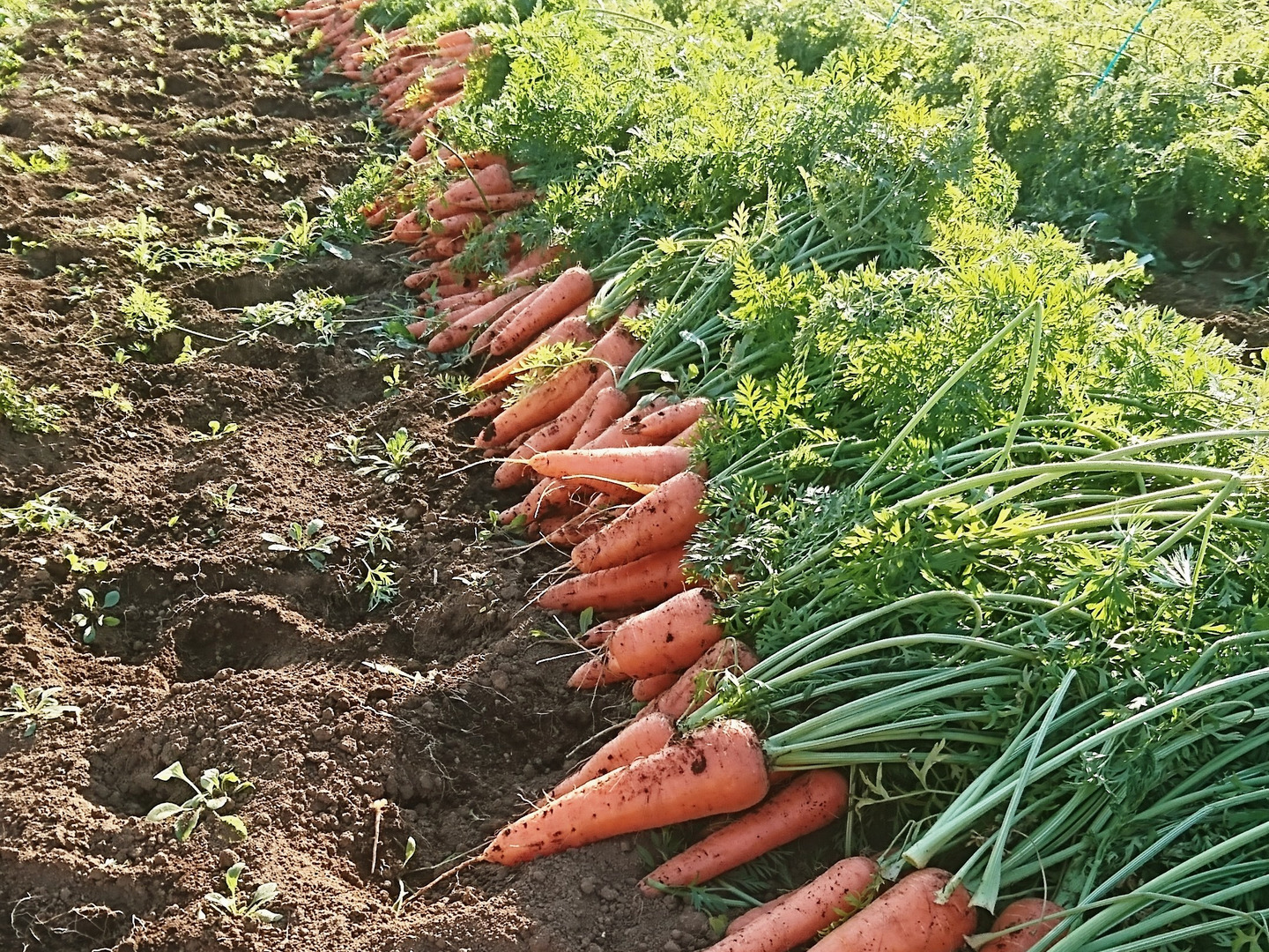 農薬、除草剤、化学肥料、動物性肥料を使用せず、植物性堆肥と糠でゆっくり育てたニンジンです。