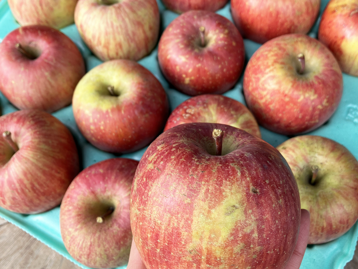 また、葉とらず栽培なので、色むらや全体的に色が薄い、赤くないりんごも入る場合がございますが、見た目がキレイなものよりもお得な値段で販売致します。悪い部分を取り除いてお召し上がりください。