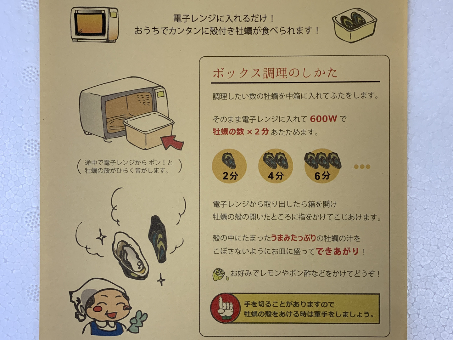 届きましたらすぐに簡単に本格的な美味しい蒸し牡蠣が電子レンジで調理できる手軽さ❗️