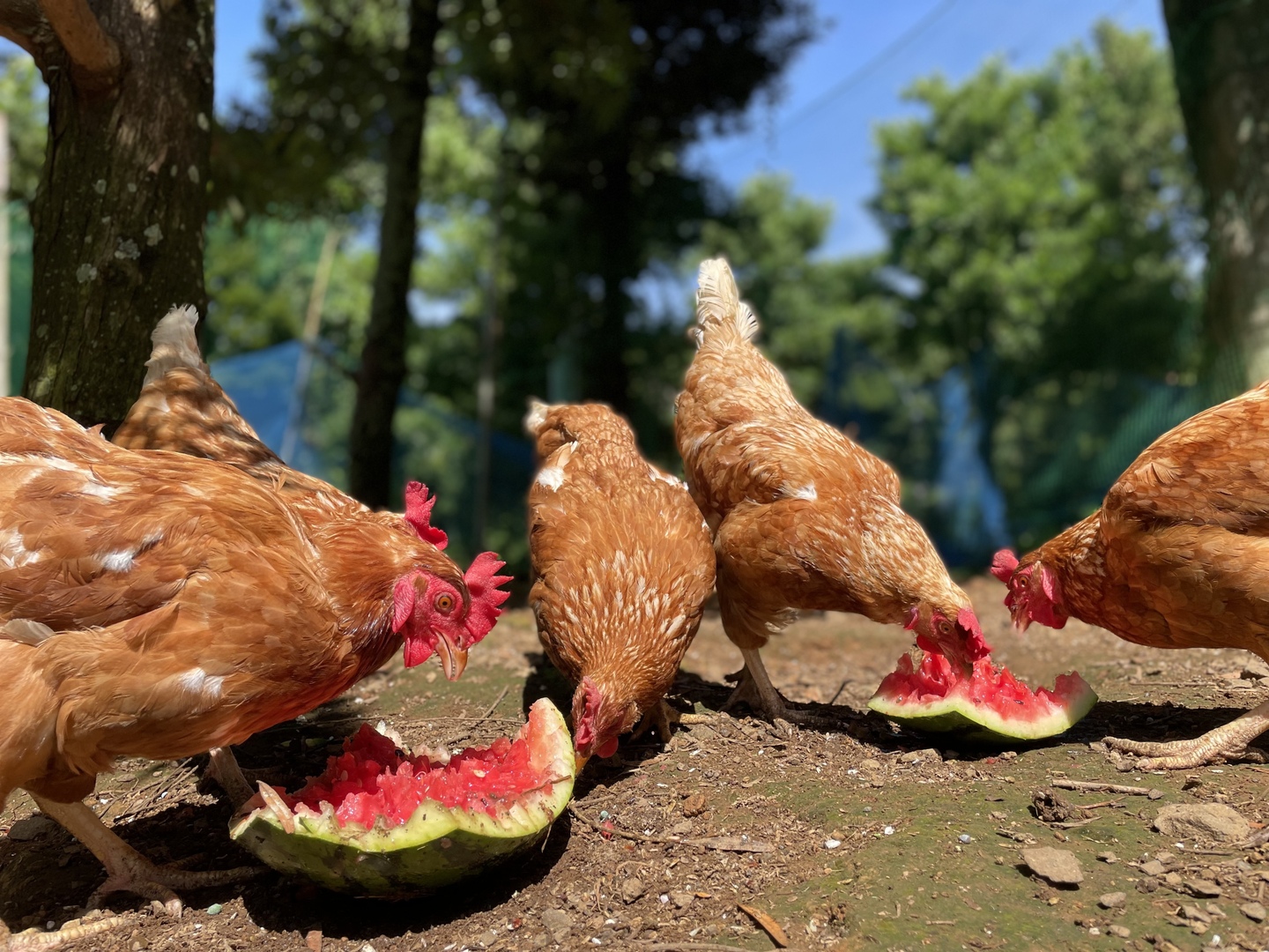 日中は自由に放牧地で地面をついばみ、季節の緑餌(りょくじ:草や青菜など)や、野菜、フルーツなどを食しています。