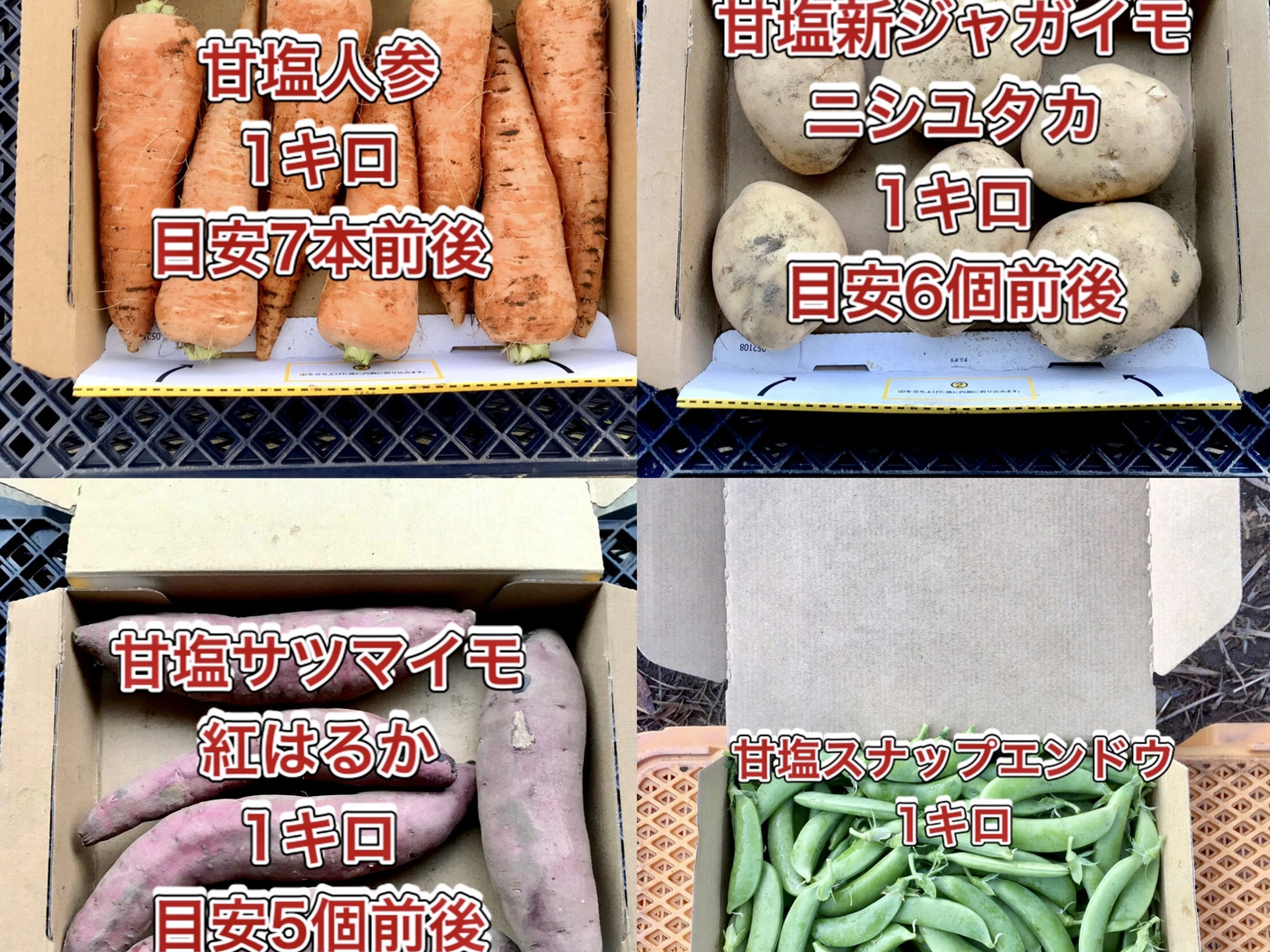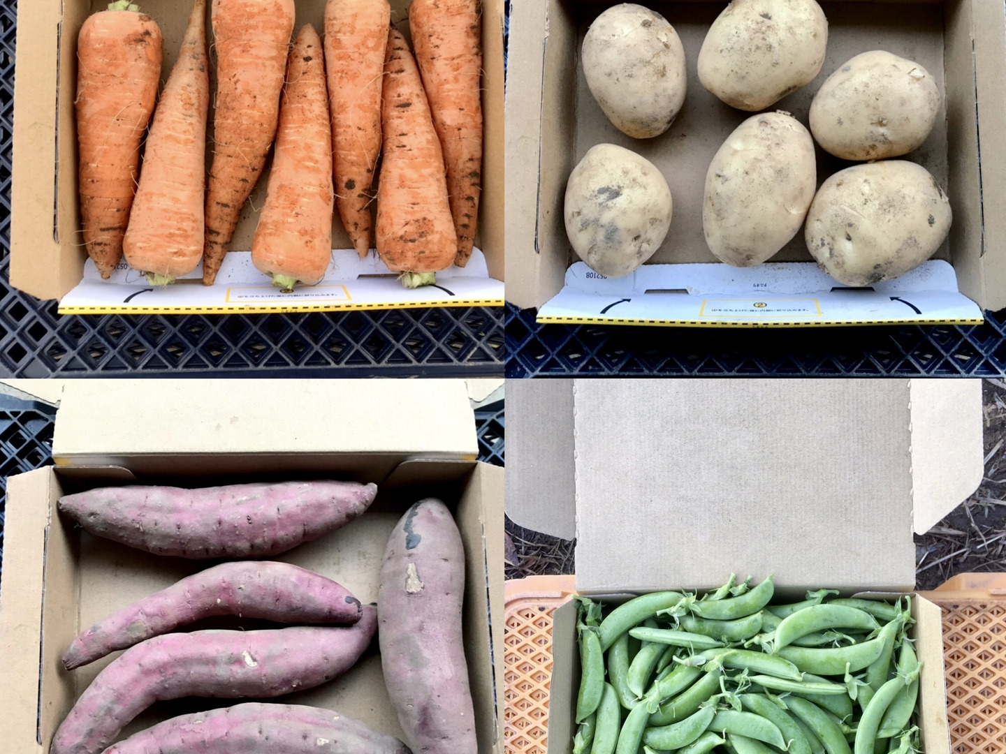 鹿児島産のジャガイモ(ニシユタカ)・サツマイモ(紅はるか)・人参・スナップエンドウ注文を受けてから、収穫日に収穫した箱込み4キロ前後を畑の空気も収穫しながらAB品大中小混合箱詰めして、当日発送します^_^
