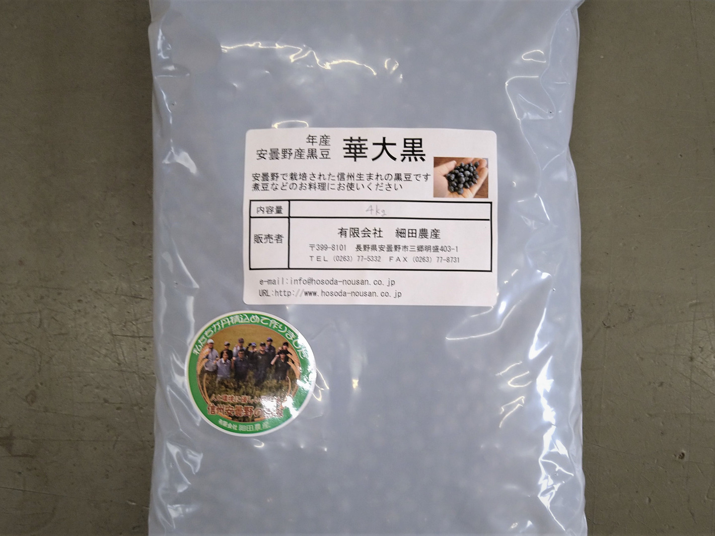信州生まれの黒豆「華大黒」。粒がしっかりしていて煮たときにふっくらした味わいが特徴の黒豆です。農薬を極力抑えて丁寧に栽培しました。