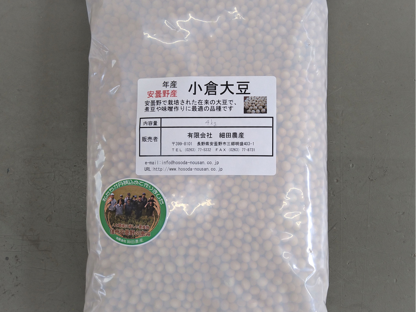 小倉大豆は信州安曇野の在来品種です。より甘みが強い大粒の大豆で、安曇野では煮豆や味噌つくりの材料として親しまれています。農薬を極力抑えて丁寧に栽培しました。