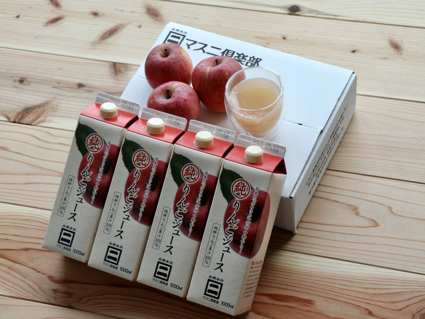 マスニ農園で収穫されたりんご100%を使った純りんごジュースです。果汁100%ストレート。