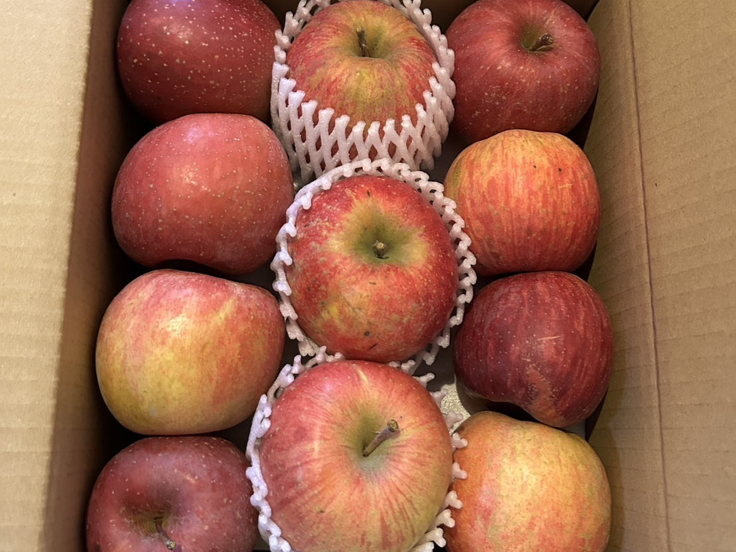 当園は、長野県北部に位置する中野市豊田地区で、3代に渡り、りんごの栽培をしています。冬は雪深く、1年を通して山々からの清水に恵まれ、四季を感じる田舎風景に囲まれています。農薬を最小限に、化学肥料は一切使わずに、安心して食べられるりんごを育てています。見た目より、味を重視して栽培しています。