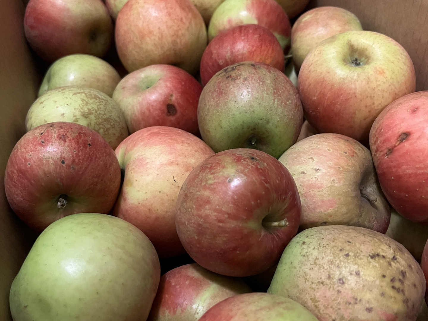 未完熟りんごを中心に、キズ、点、スス等のはねだしたりんごを入れています。しわのでた、柔らかいりんごも入ります。