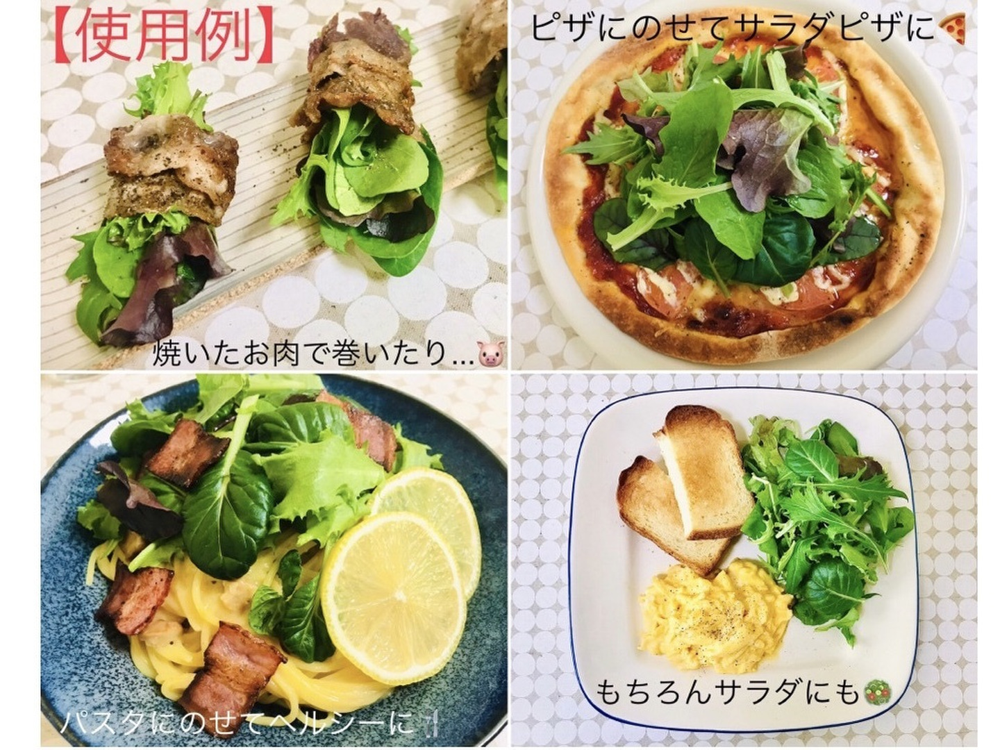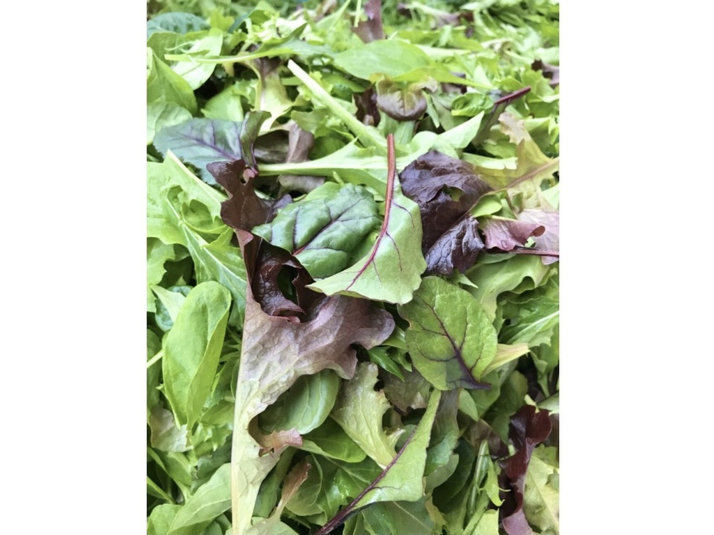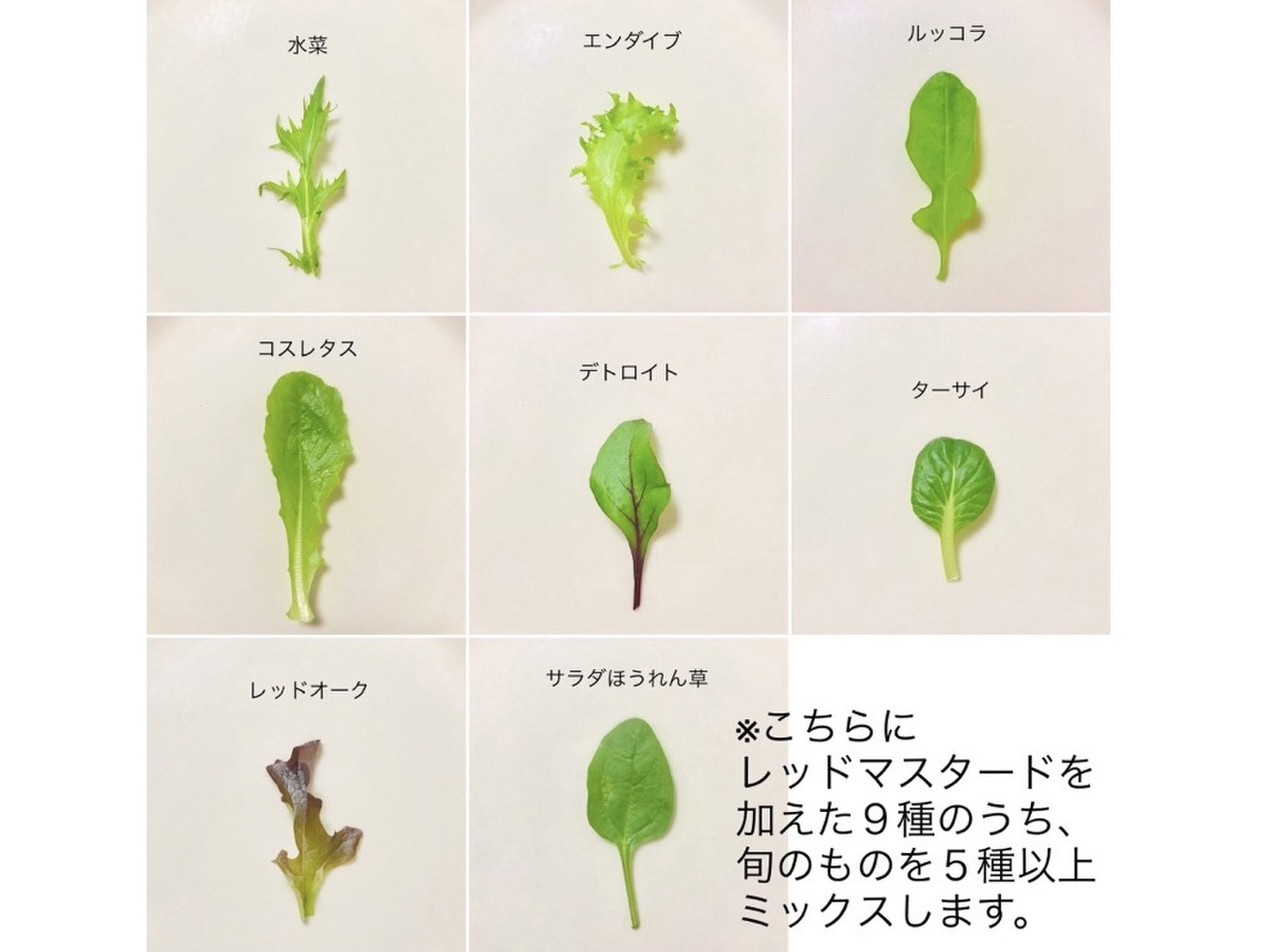 ルッコラ、水菜、サラダほうれん草、コスレタス 、レッドオーク、エンダイブ、デトロイト、ターサイ、レッドマスタードから旬のものを5品種以上ミックスします。