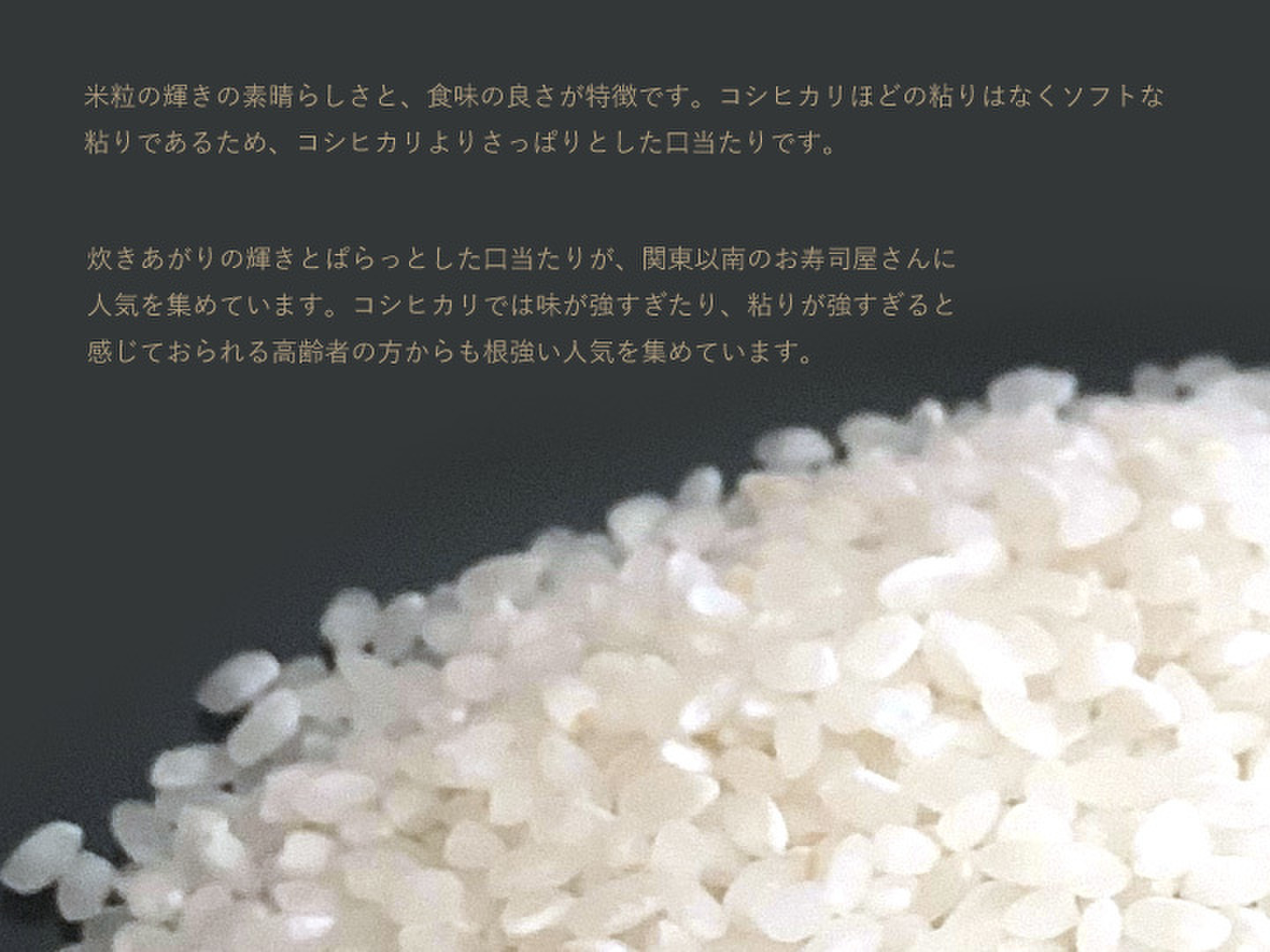 炊きあがりの輝きとぱらっとした口当たりが、関東以南のお寿司屋さんに人気を集めています。コシヒカリでは味が強すぎたり、粘りが強すぎると感じておられる高齢者の方からも根強い人気を集めています。