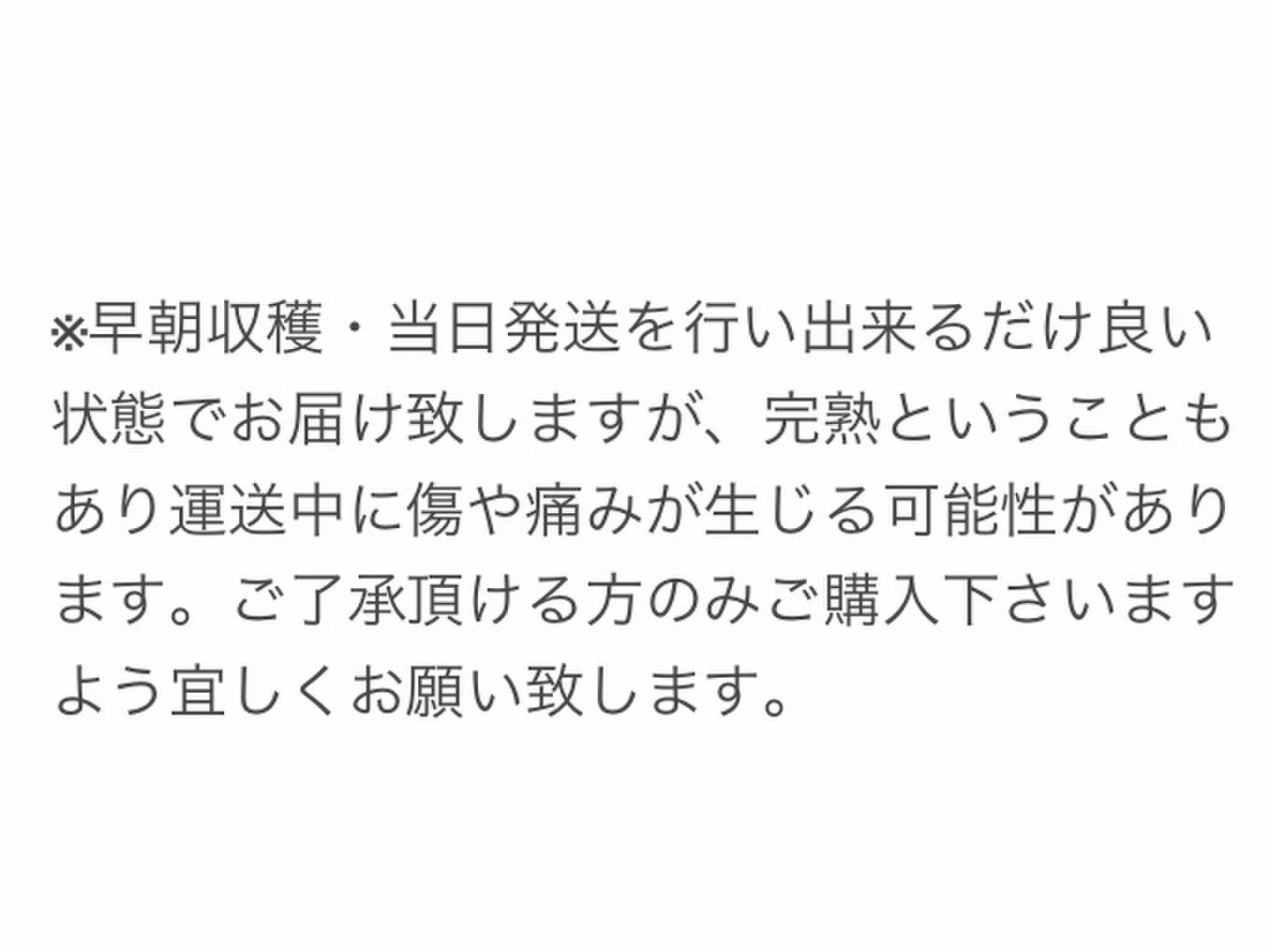 ※早朝収穫・当日発送を行い出来るだけ良い状態でお届けできるよう頑張りますが、完熟ということもあり輸送中に傷や痛みが生じる可能性があります。