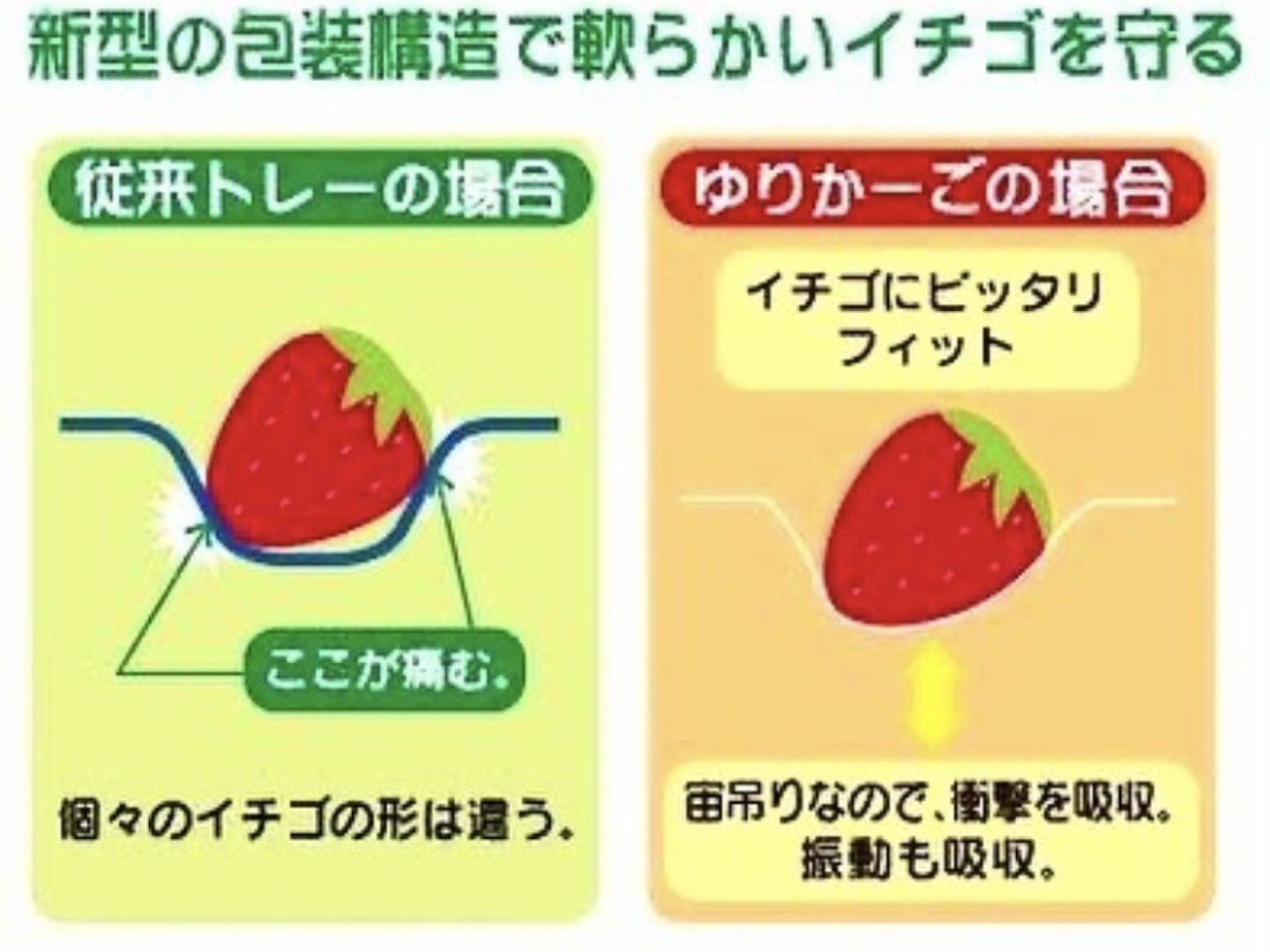 →新型容器の「ゆりかーご」を使用しております。いちごが痛むことを防止し見た目も上品で高級感があります。
