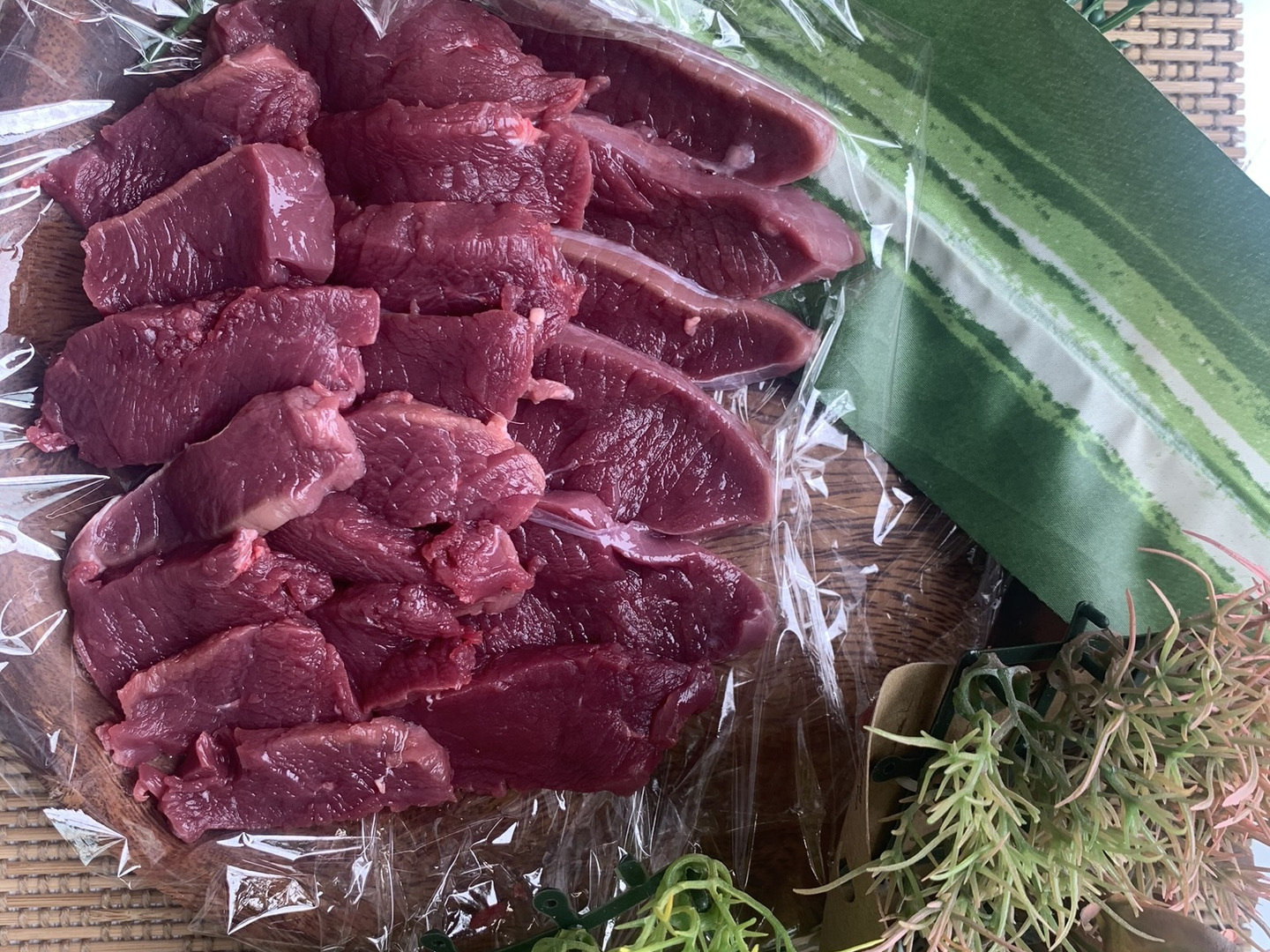 自然豊かな山に囲まれ、びわ湖のおいしい水を飲んで育ったシカのモモを焼肉用にスライスしました。