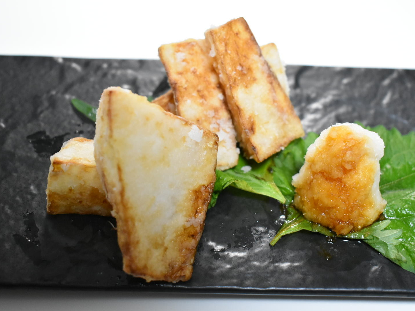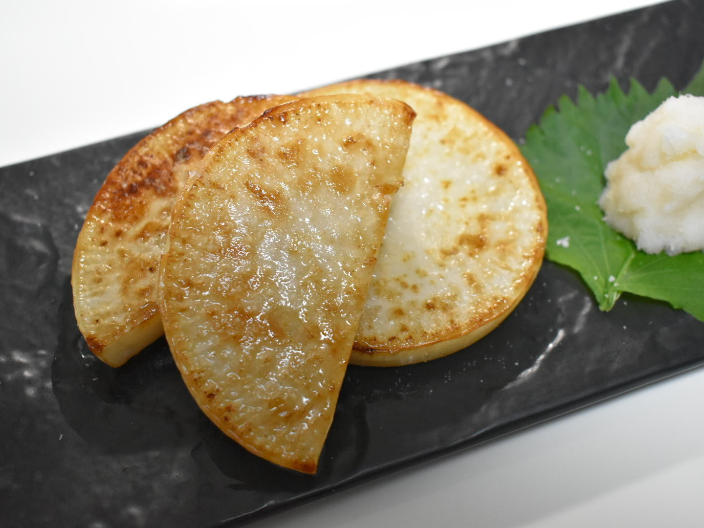 太い部分は素焼きで、細長い根先は大根おろしでお召し上がりください。