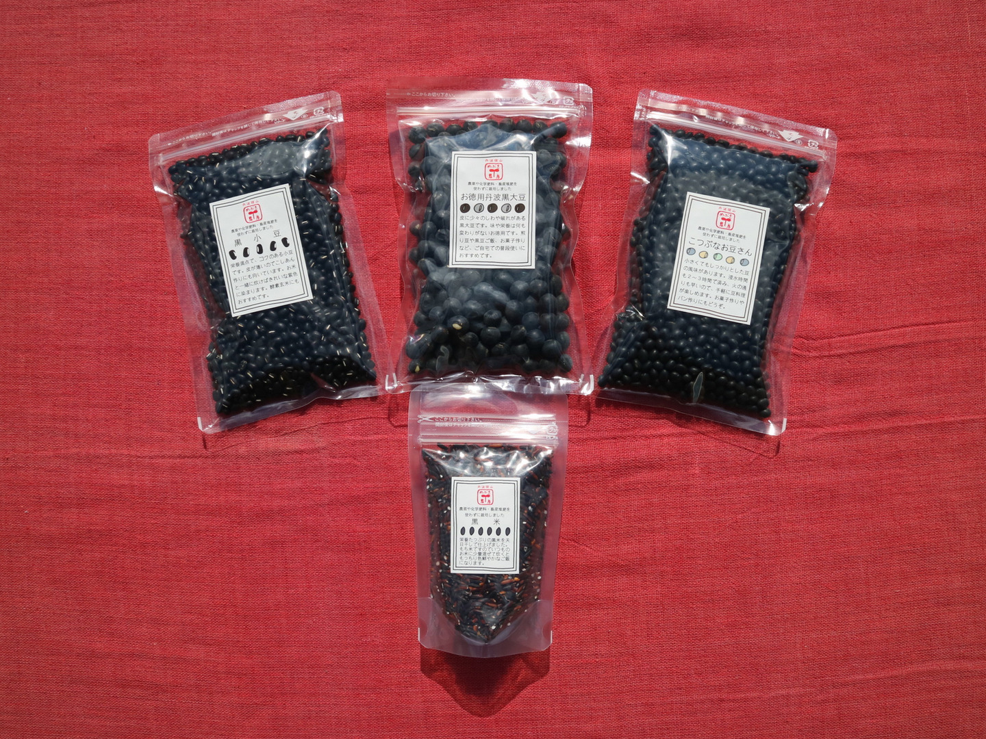 丹波篠山めぶき農房で栽培している黒い大豆や小豆と黒米のセットです。