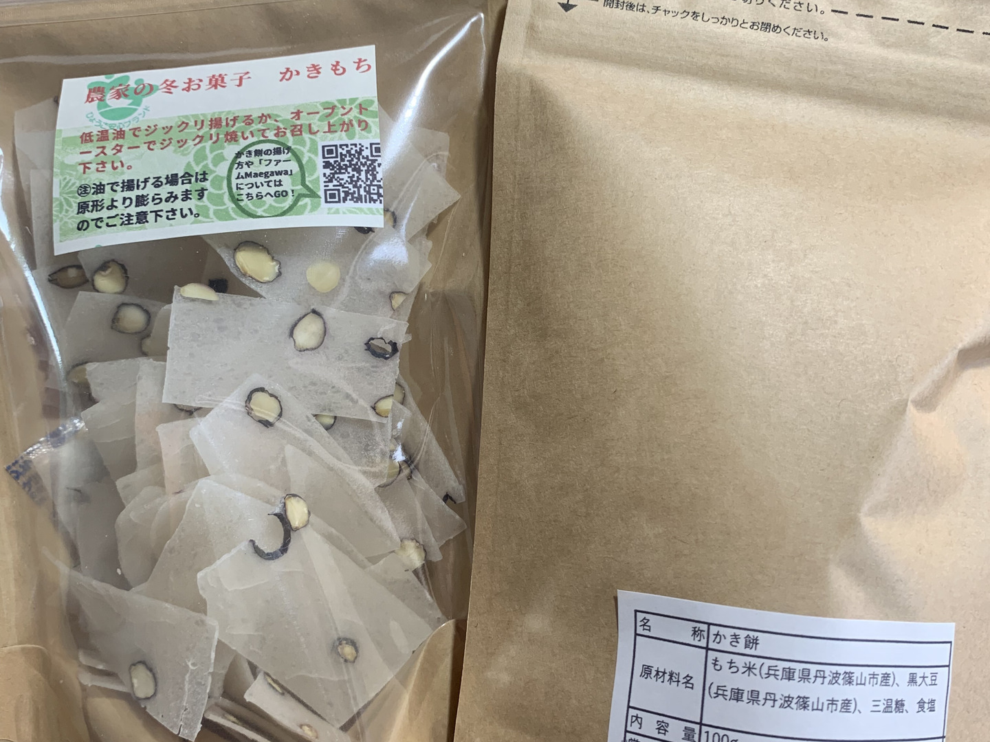 このかき餅は丹波篠山の豊かな自然の中で育てた50%減農薬のもち米・農薬一切無しの黒大豆・ビーツに三温糖と食塩だけをプラスして作った、いたってシンプルなお菓子です。