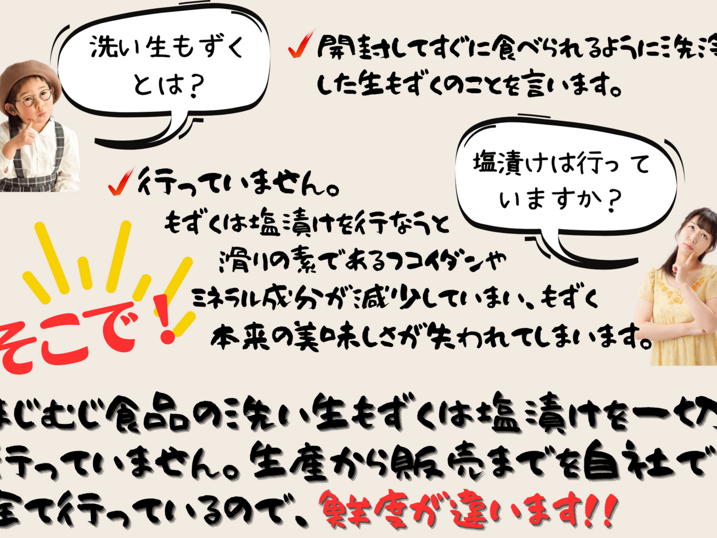 そこで、私たちの洗い生もずくは塩漬けを一切行っていません。