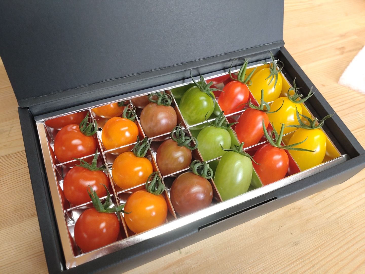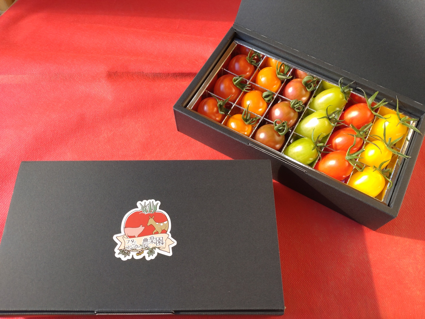 お洒落な専用BOXに詰め合わせたミニトマトのセットです。