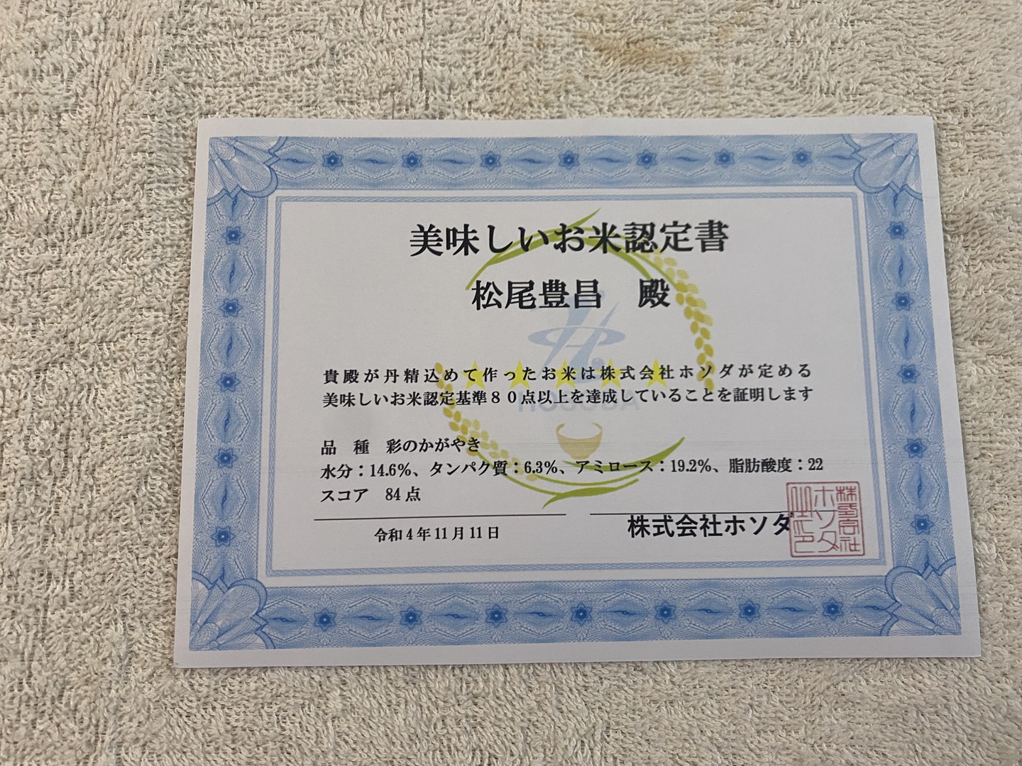 今年、ホソダ(株)主催の第7回食味コンクールで彩のかがやきは84点、彩のきずなは83点の高得点を獲得しました。信頼のある静岡製機(株)の測定器で測定しております。