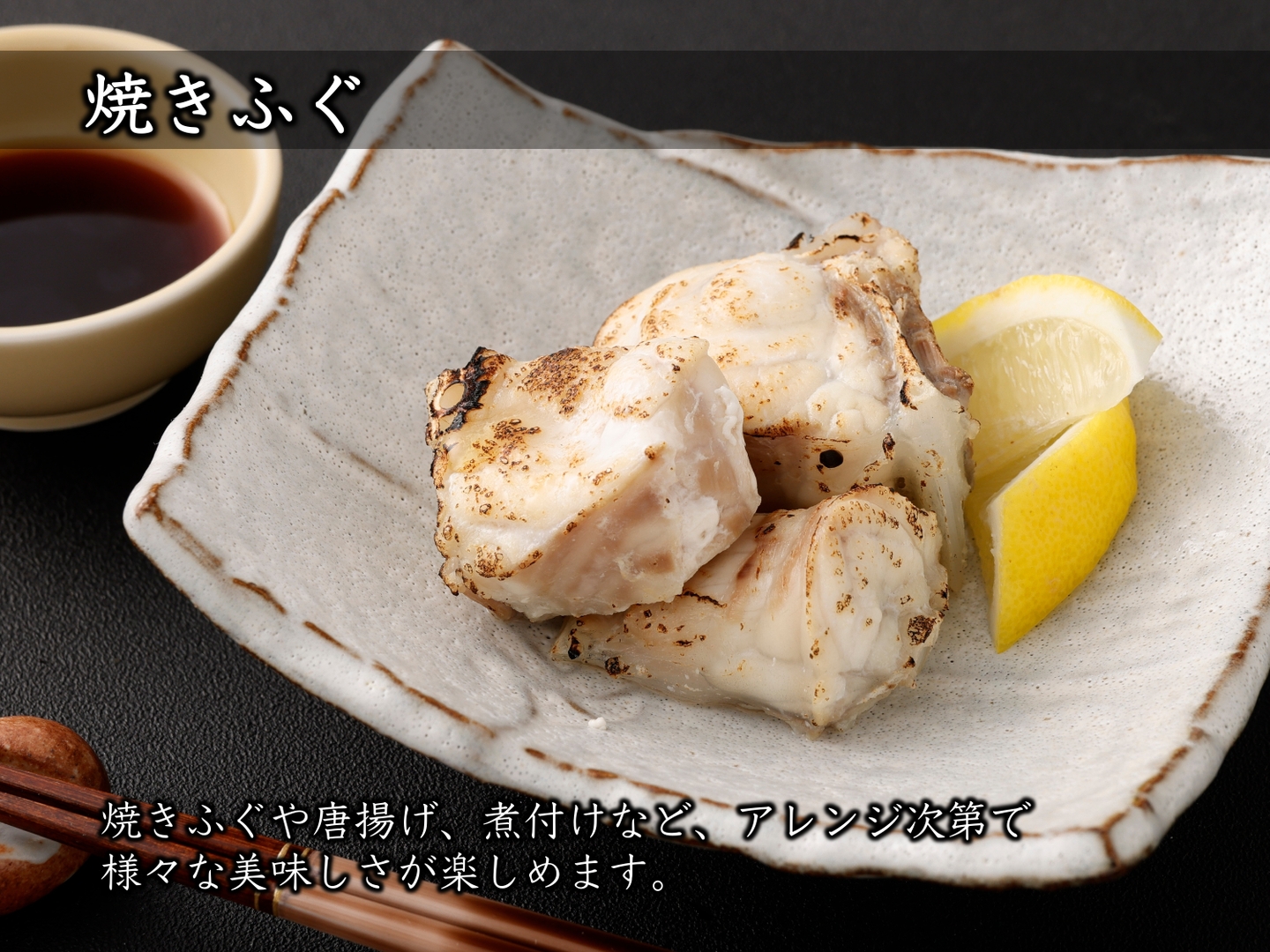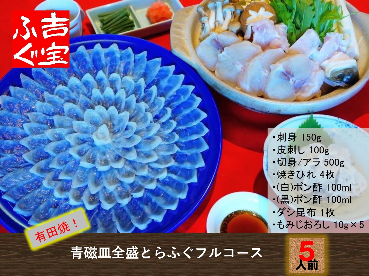 | 内容 | 刺身150g(34cm青磁皿全盛) 皮刺し100g 切り身/アラ500g 焼きひれ4枚 白ポン酢100ml 黒ぽん酢100ml 昆布1枚 もみじおろし10g×5 | ||||||