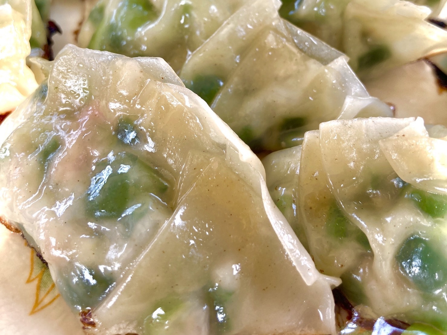 【材料】ネギ150g、餃子の皮、豚ミンチ50g、塩コショウ少々、鶏がらスープの素小さじ1/3、ゴマ油少々