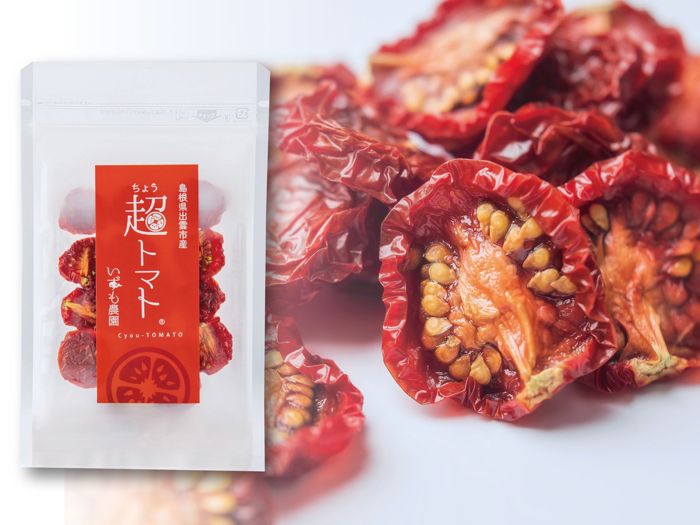 収穫したての超トマトを半分にカットし、皮ごと低温で長時間じっくりと、じっくりと時間をかけて乾燥させました。