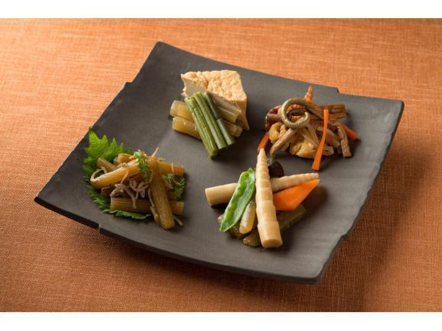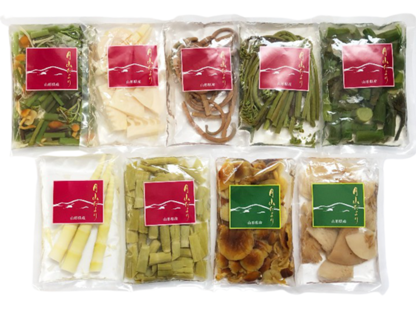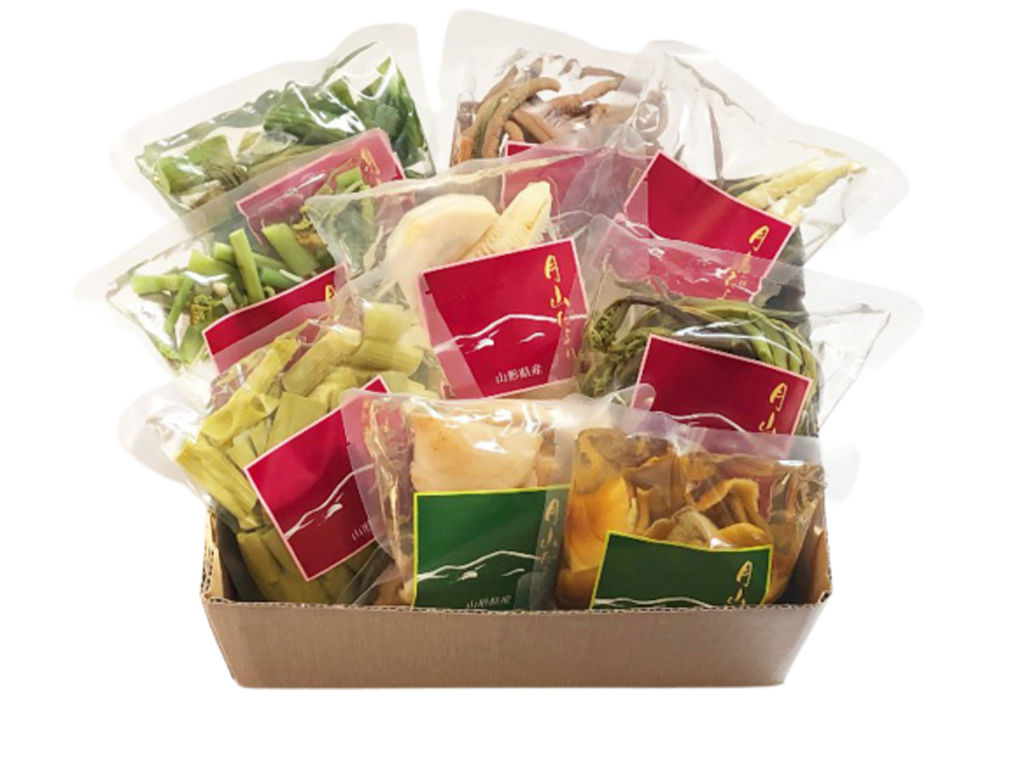 この商品の原材料である山菜・きのこは主に出羽の国(山形県)に聳える霊峰月山山系で採取した優良国産品をさらに厳選しました。加えて水にもこだわり月山山系を脈々滔々と流れるミネラル・マイナスイオンの豊富な月山伏流水を使用しています。