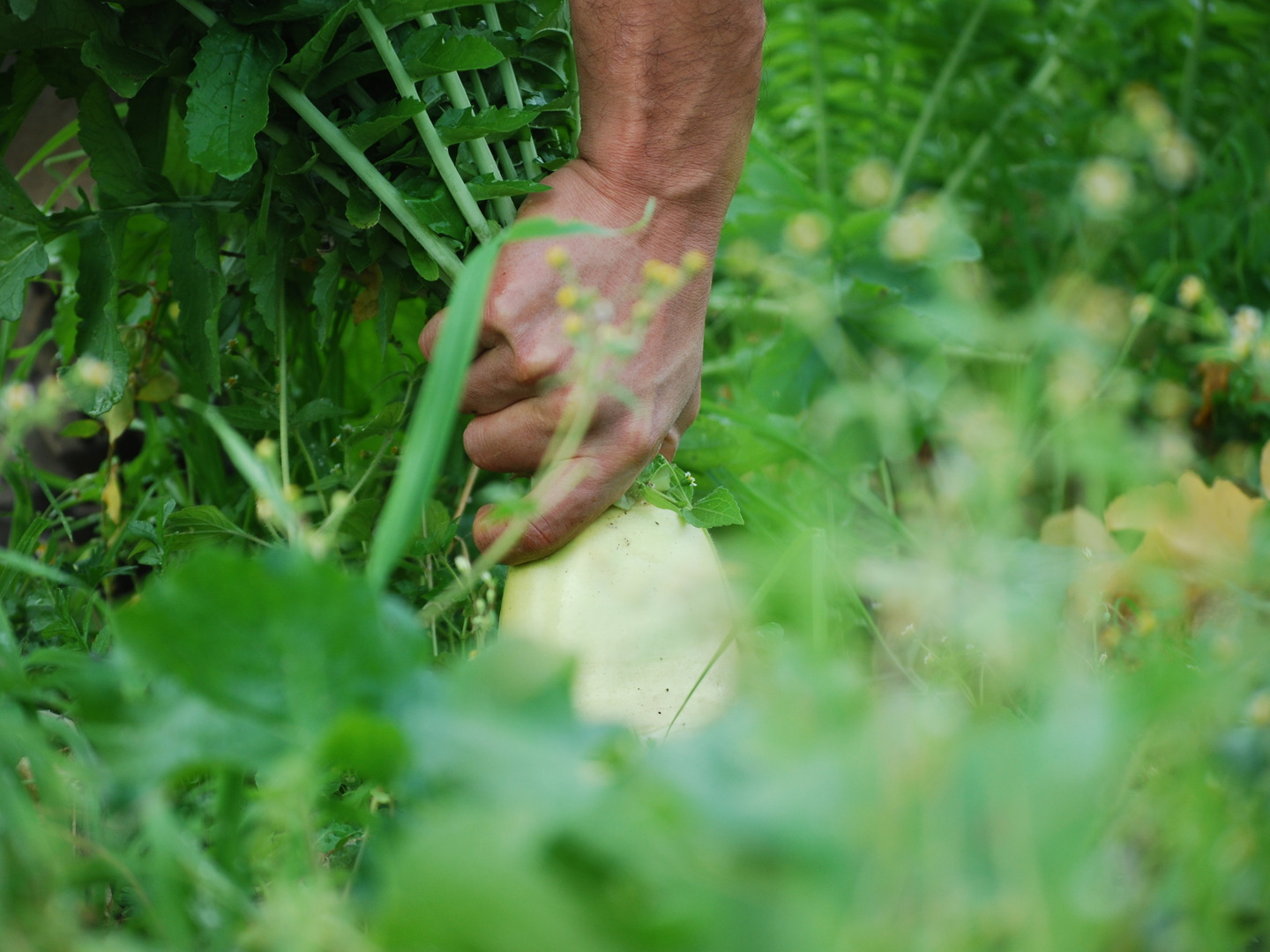 大地が健康であれば、自然の営みの中で作物は健康に育ちます。健康な大地は枯葉や枝を小動物や微生物が分解し、長い年月をかけて土となっています。サンファーム 高橋では少ない有機質肥料でゆっくり時間をかけることで、作物自身の持つ生命力を引き出し、強い野菜に育てています。