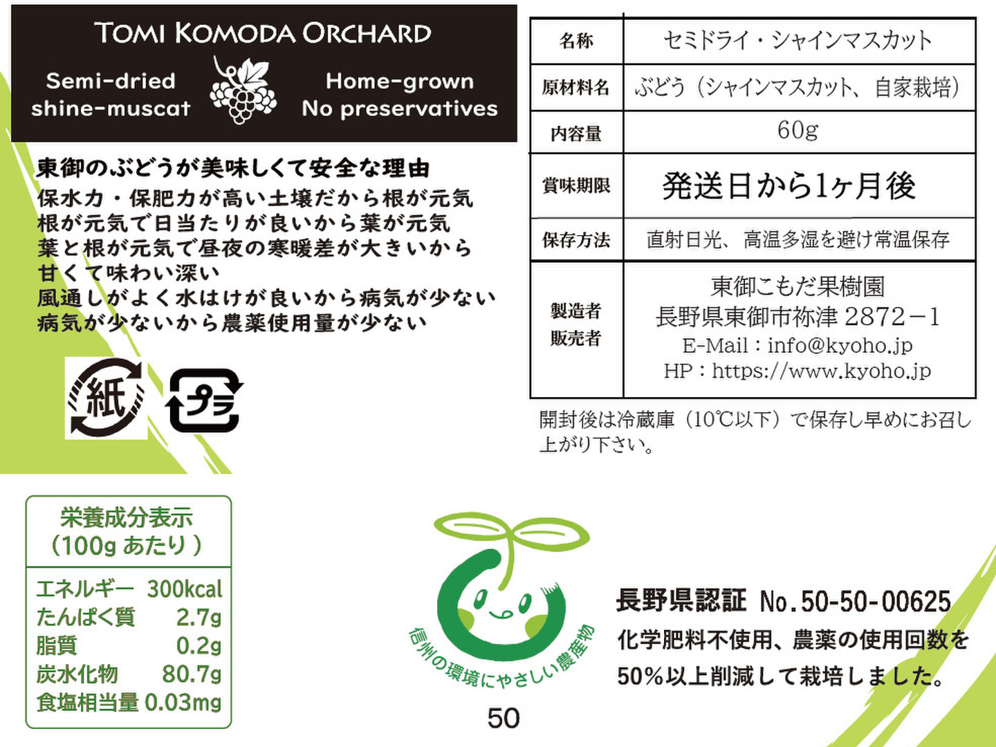 ★セミドライシャインマスカット(60g)1個★信州の環境にやさしい農産物(長野県認証)