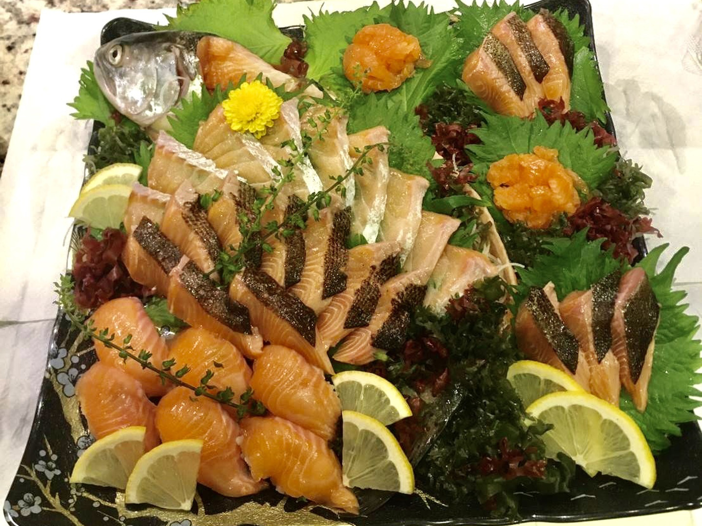 1㎏のビワマスを上手に捌くと半身で5~6人前の刺身が取れます。