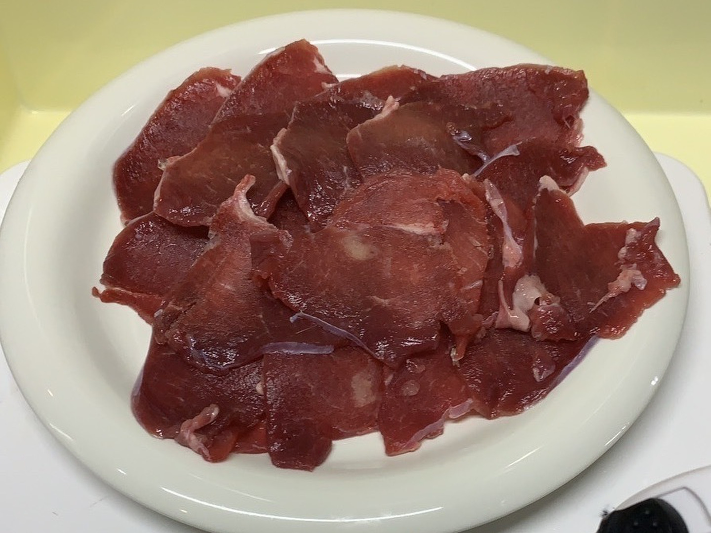 焼き肉用スライスはモモ肉を5 mmにスライスしています。しゃぶしゃぶ用に比べて分厚くなっています。焼き肉はもちろん、ピーマンやナスと一緒に青椒肉絲風の炒め物にして食べるのもおすすめです。