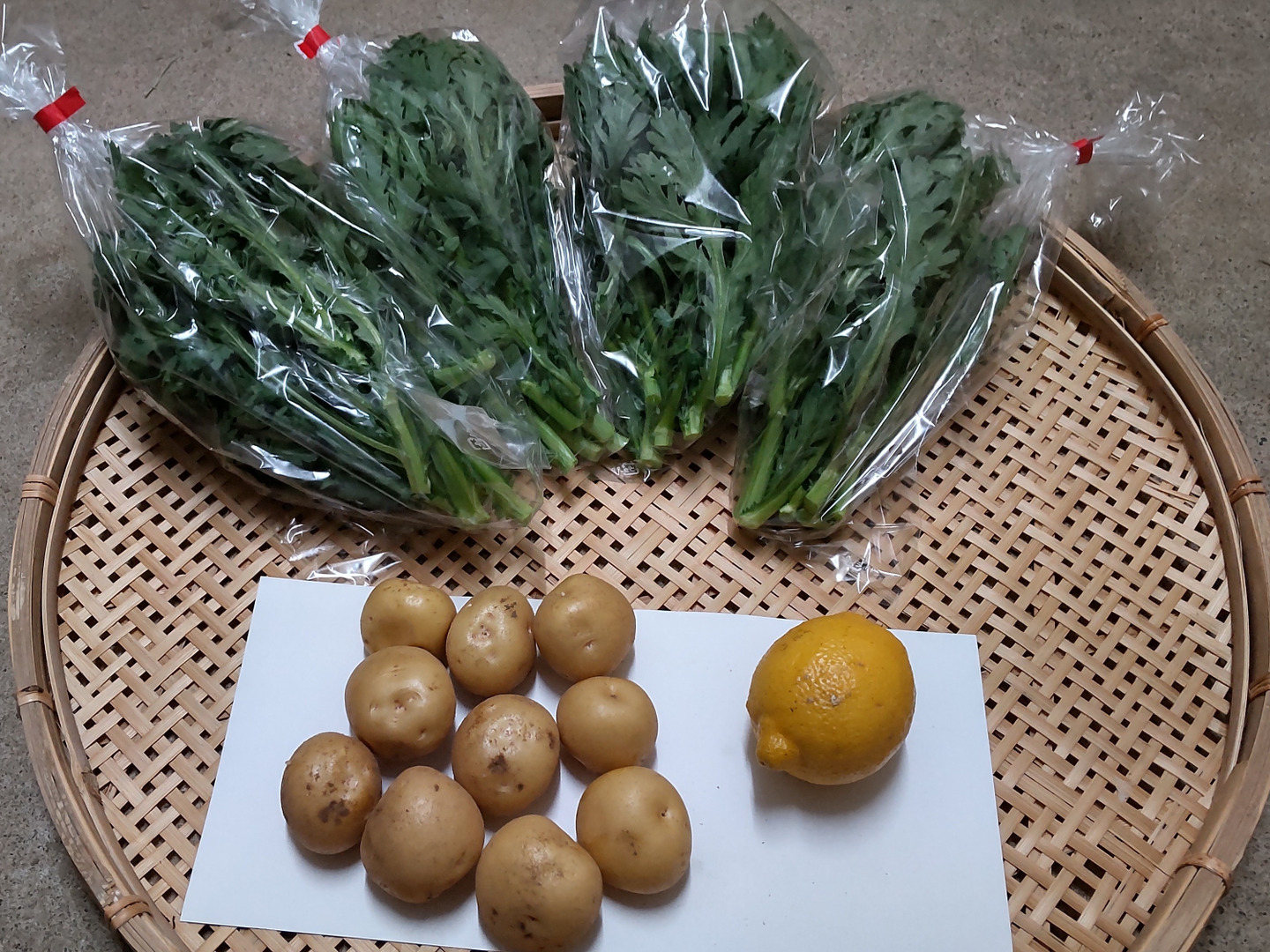 春菊、レモン、ミニジャガイモの3点の野菜セットになります。春の味と香りが口の中に広がります。