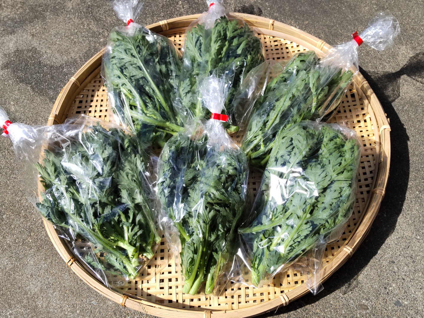香り高い春菊です。柔らかい新芽の部分を収穫しました。「春菊はあの苦味がどうも・・」という方にこそぜひおすすめしたいです。今までのイメージが変わります。サラダ、サンドイッチの具やシンプルなごま油あえなど生でも気軽に使えます。