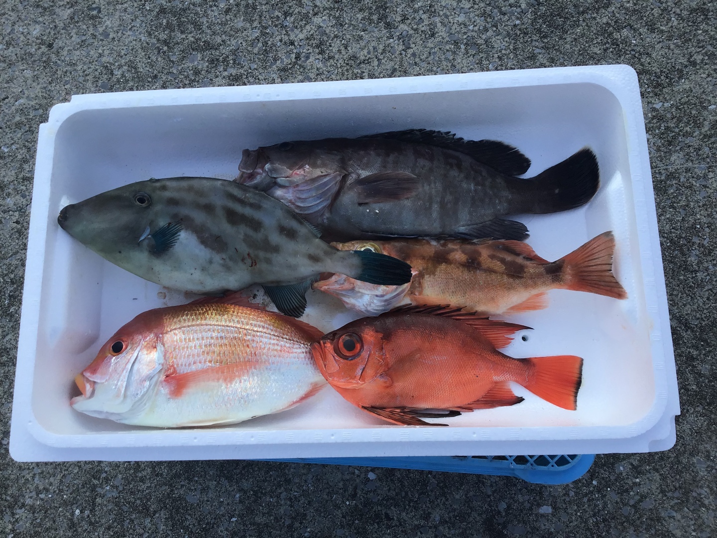 ウマズラハギ×1、マハタ×1、チカメキントキ×1、レンコダイ×1、メバル×1