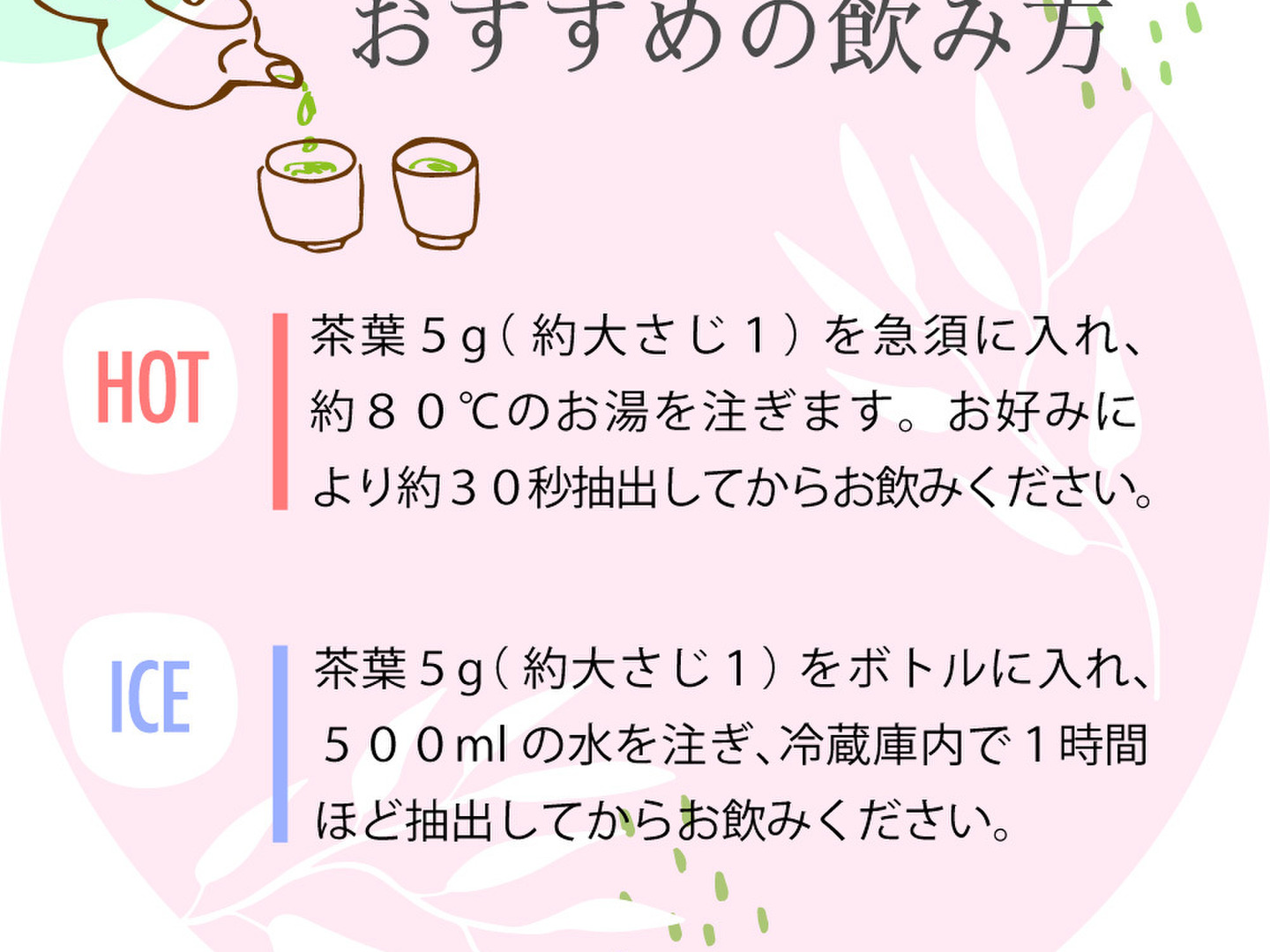 5gの茶葉に、80度のお湯を300ml注ぎ、30秒ほどお待ちいただいてからお飲みください。