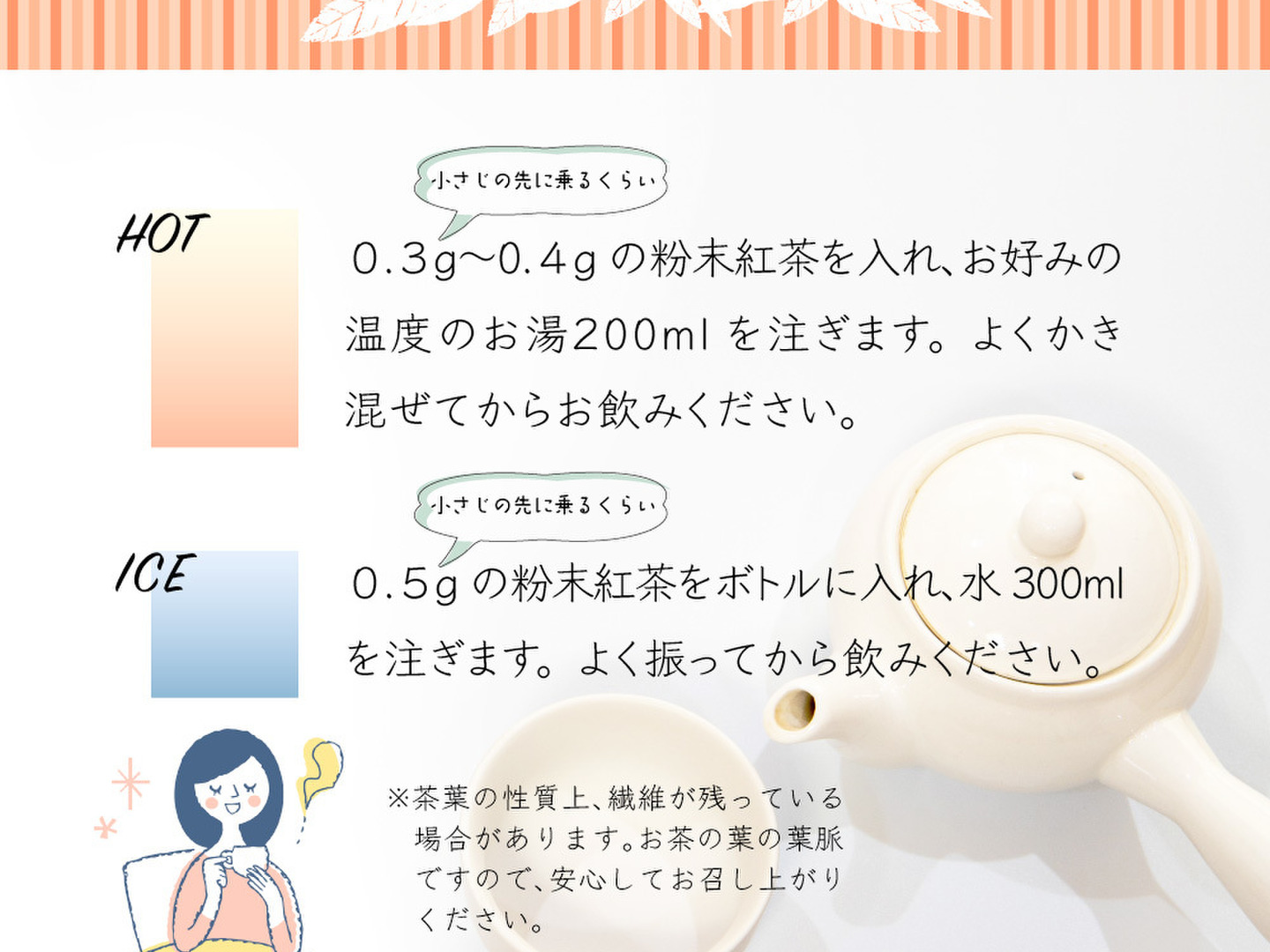 インスタント茶や粉茶と異なり、茶葉をそのまま粉砕しております為、葉脈や食物繊維などが溶けきらずに底に残る場合がございます。