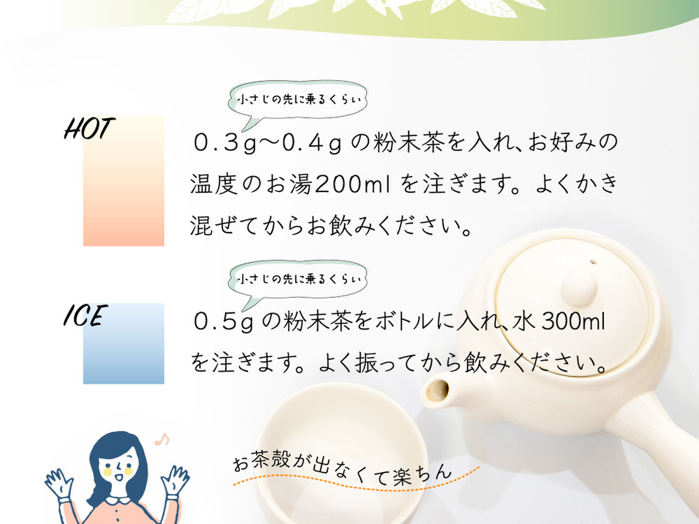 粉末茶なので水やお湯にさっと溶け、茶殻が出なく淹れるのが簡単。