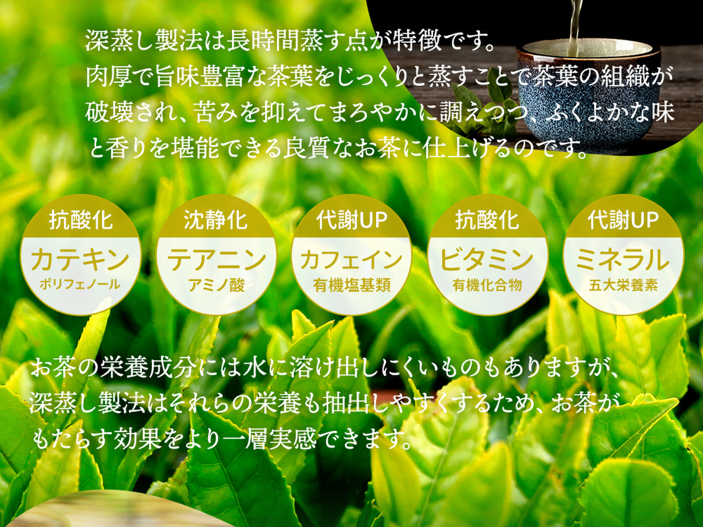 深蒸し茶を飲むことによって、カテキン等の可溶性の有効な成分を効果的に、美味しく取ることができます。