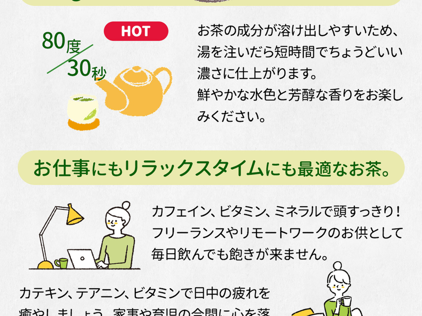 5gの茶葉に、80度のお湯を300ml注ぎ、30秒ほどお待ちいただいてからお飲みください。
