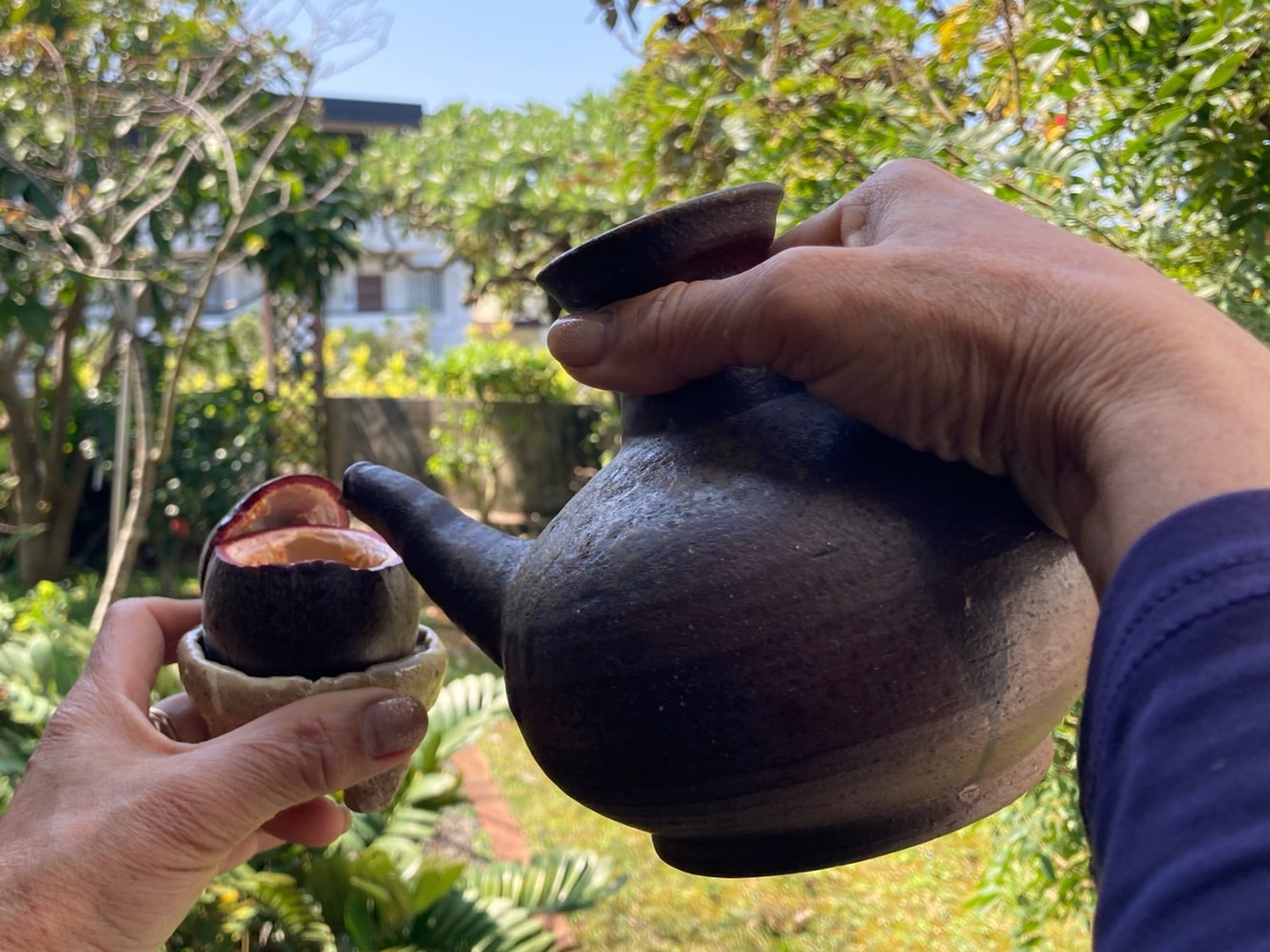 外皮は固くて食べられませんが、ゼリーの器にしたり、上部をフタのようにカットして、スプーンで中の果肉と種を内側の皮からはがし、泡盛を注いで杯として楽しむ、という地元の酒飲みおじさん達の粋なアイデアも!