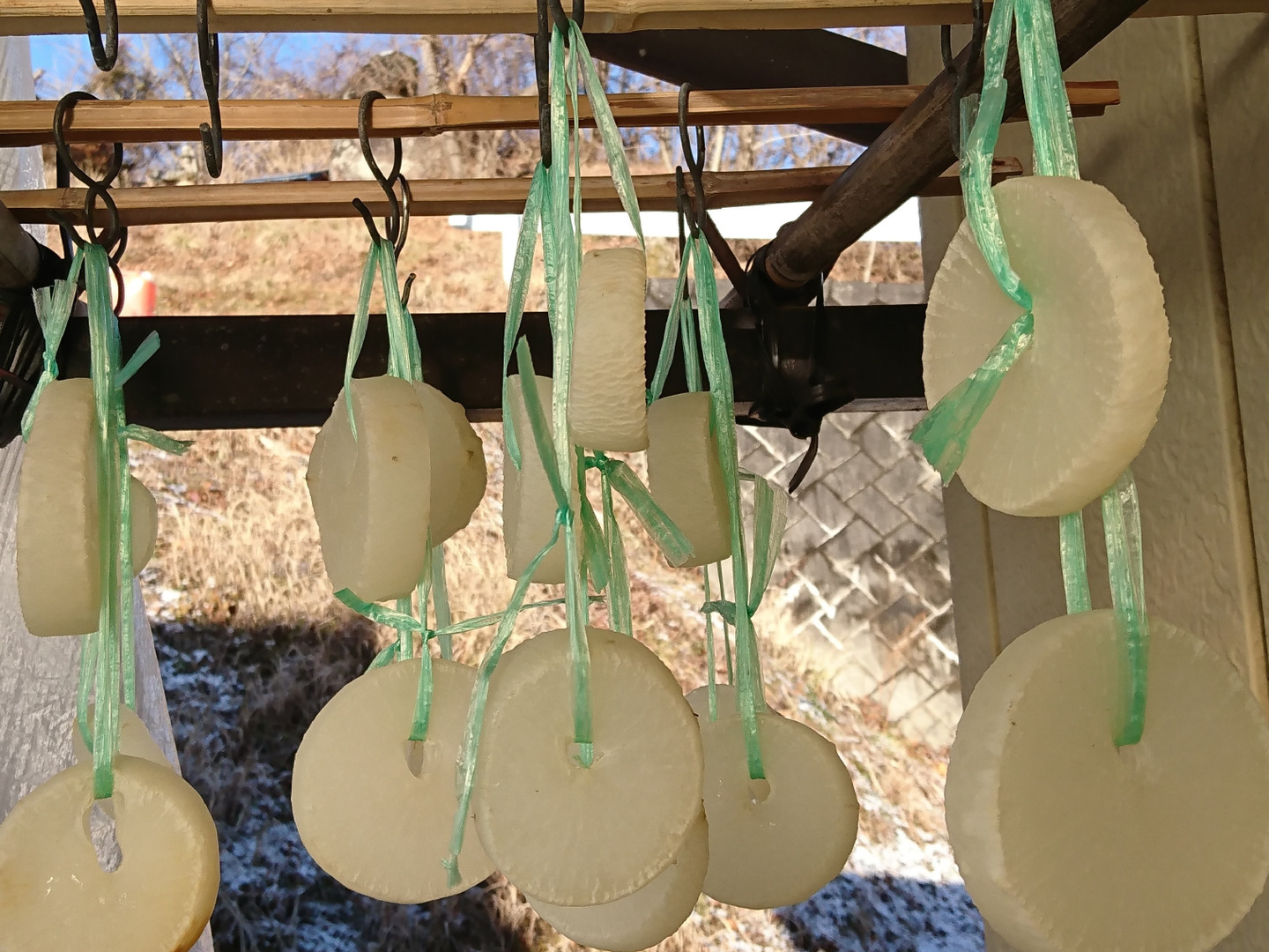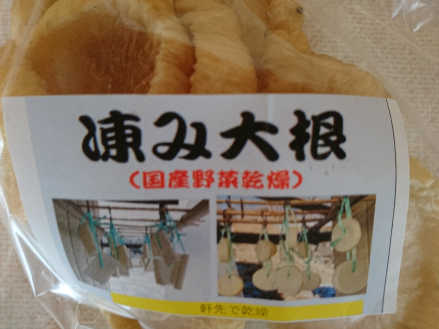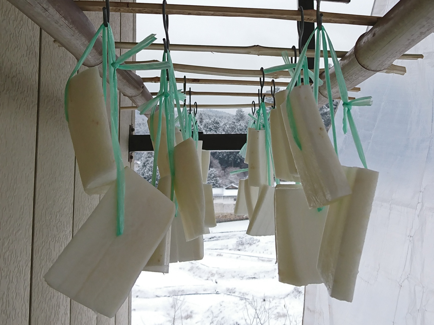 栽培・生産のこだわり:冬の寒い時期に、大根を湯がき、その後流水にさらし、あくを抜きました。更に寒い外気にさらし乾燥。これが凍み大根です。