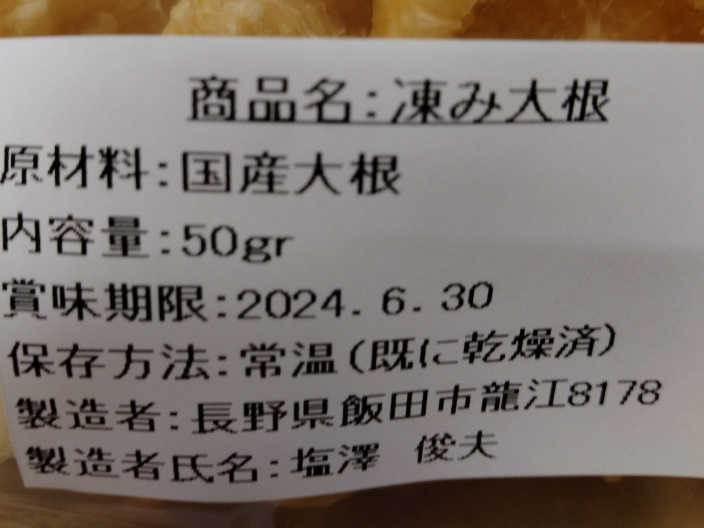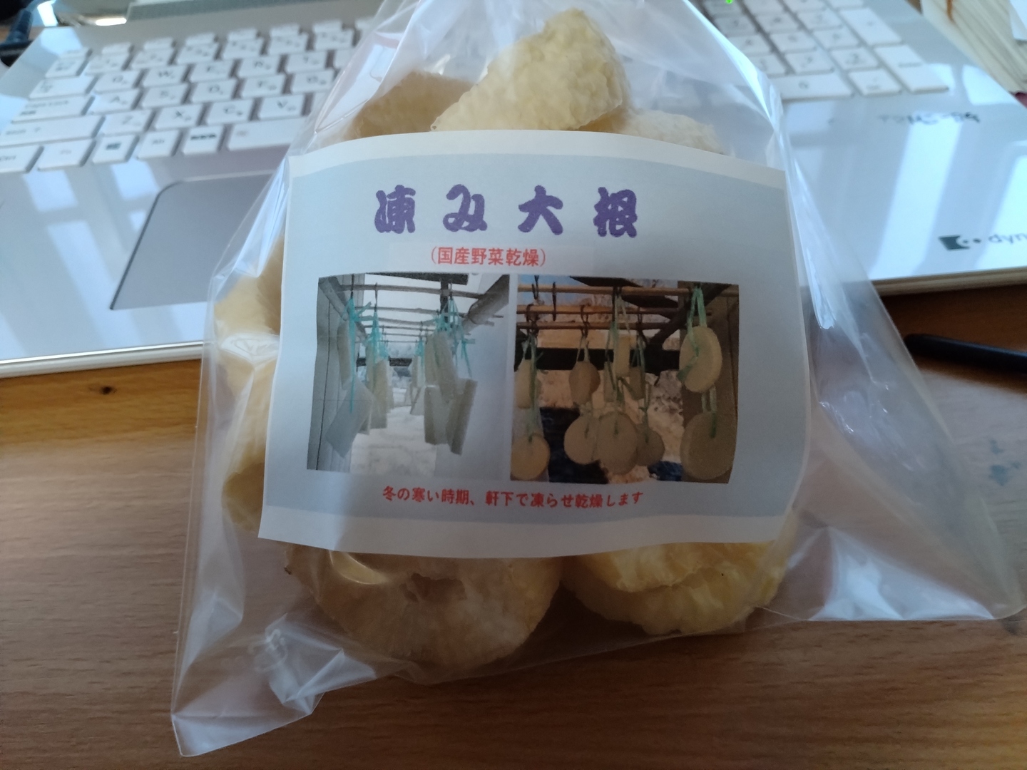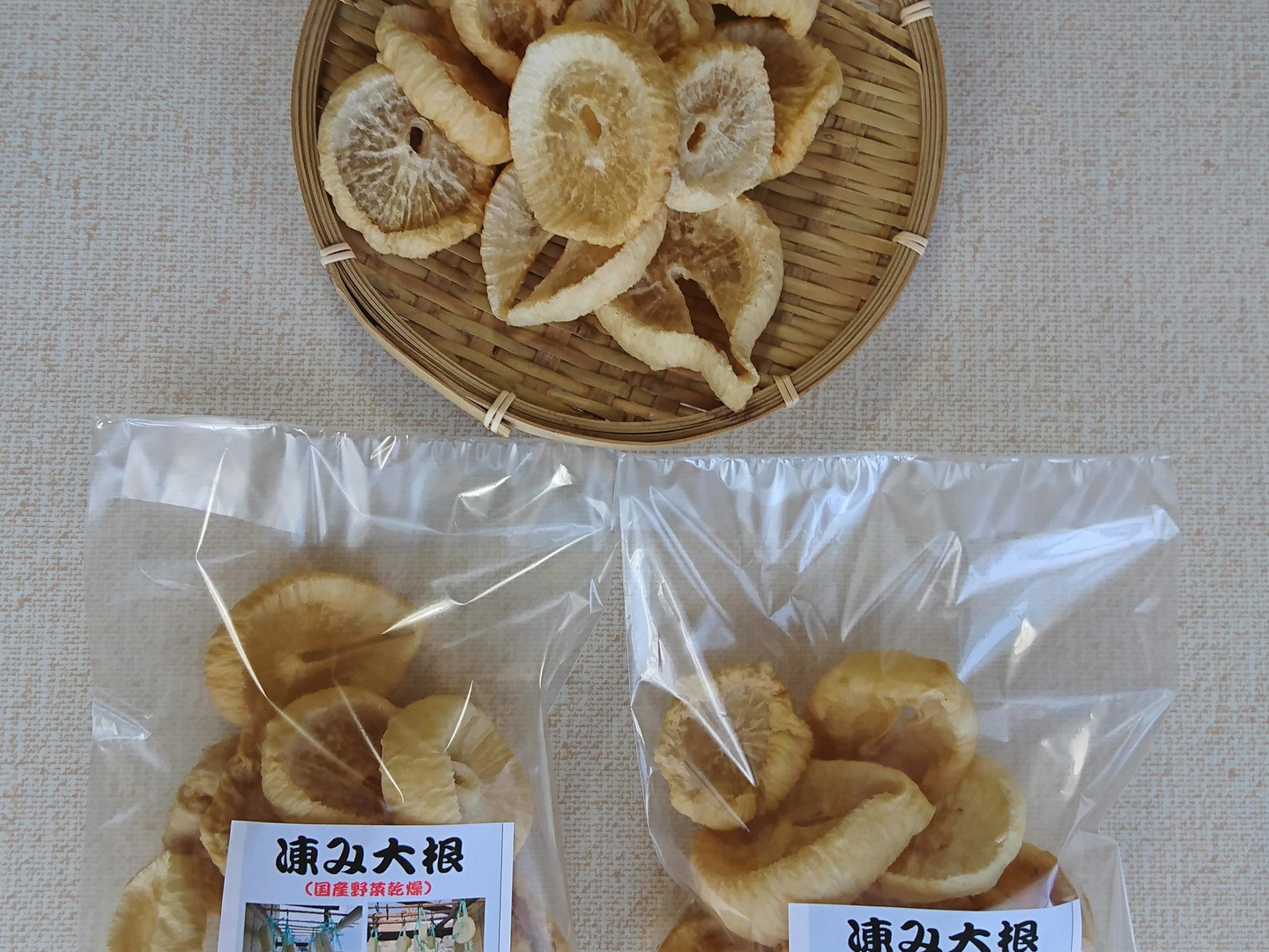 栽培・生産のこだわり:冬の寒い時期に、大根を湯がき、その後流水にさらし、あくを抜きました。更に寒い外気にさらし乾燥。これが凍み大根です。