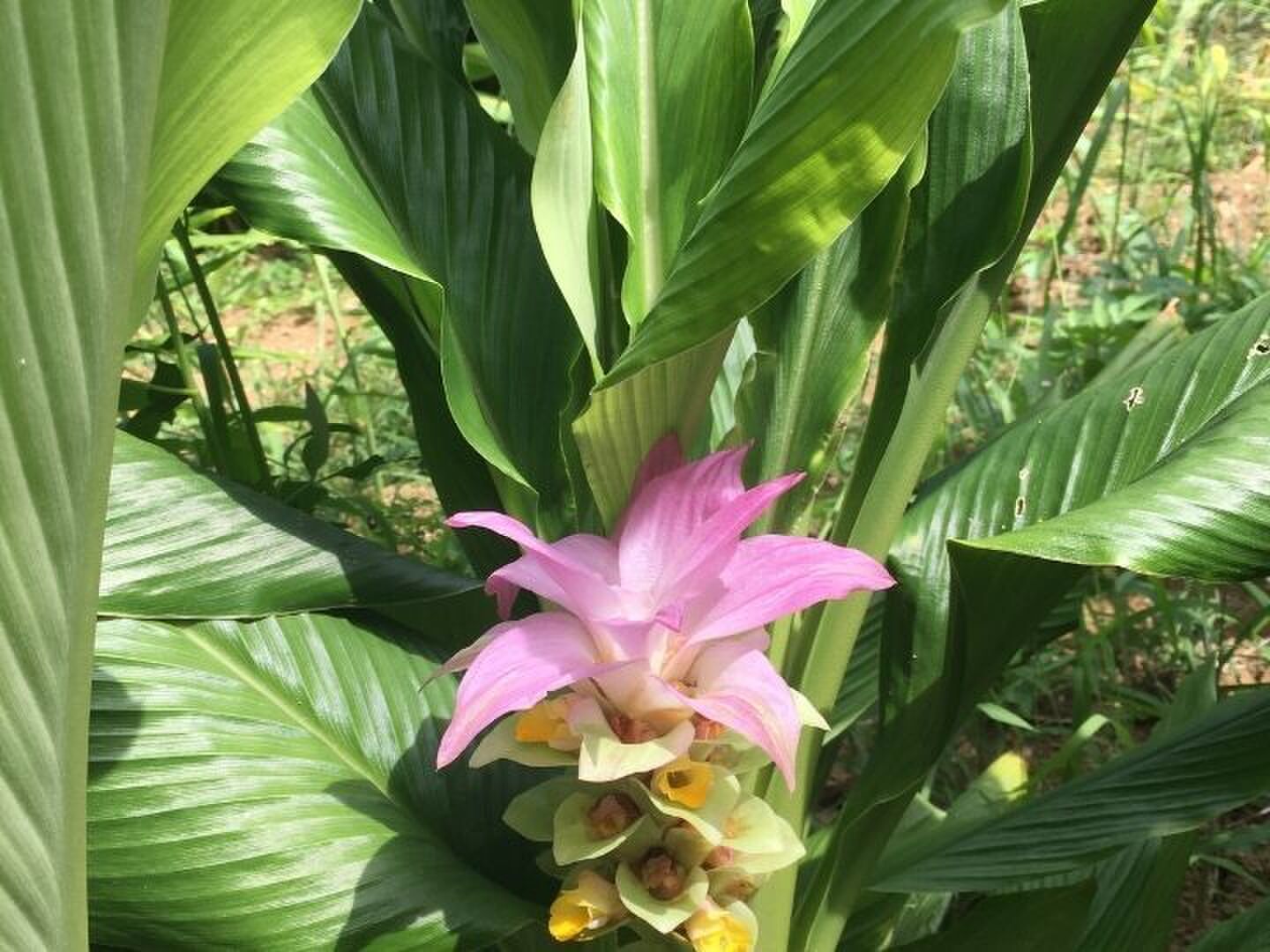 ・春ウコンは春に発芽して葉の育ち始めのときにピンク色の花を咲かせます。葉は背丈ほどに成長し、葉の裏はビロードのような絨毛があることで秋ウコンと区別されます。