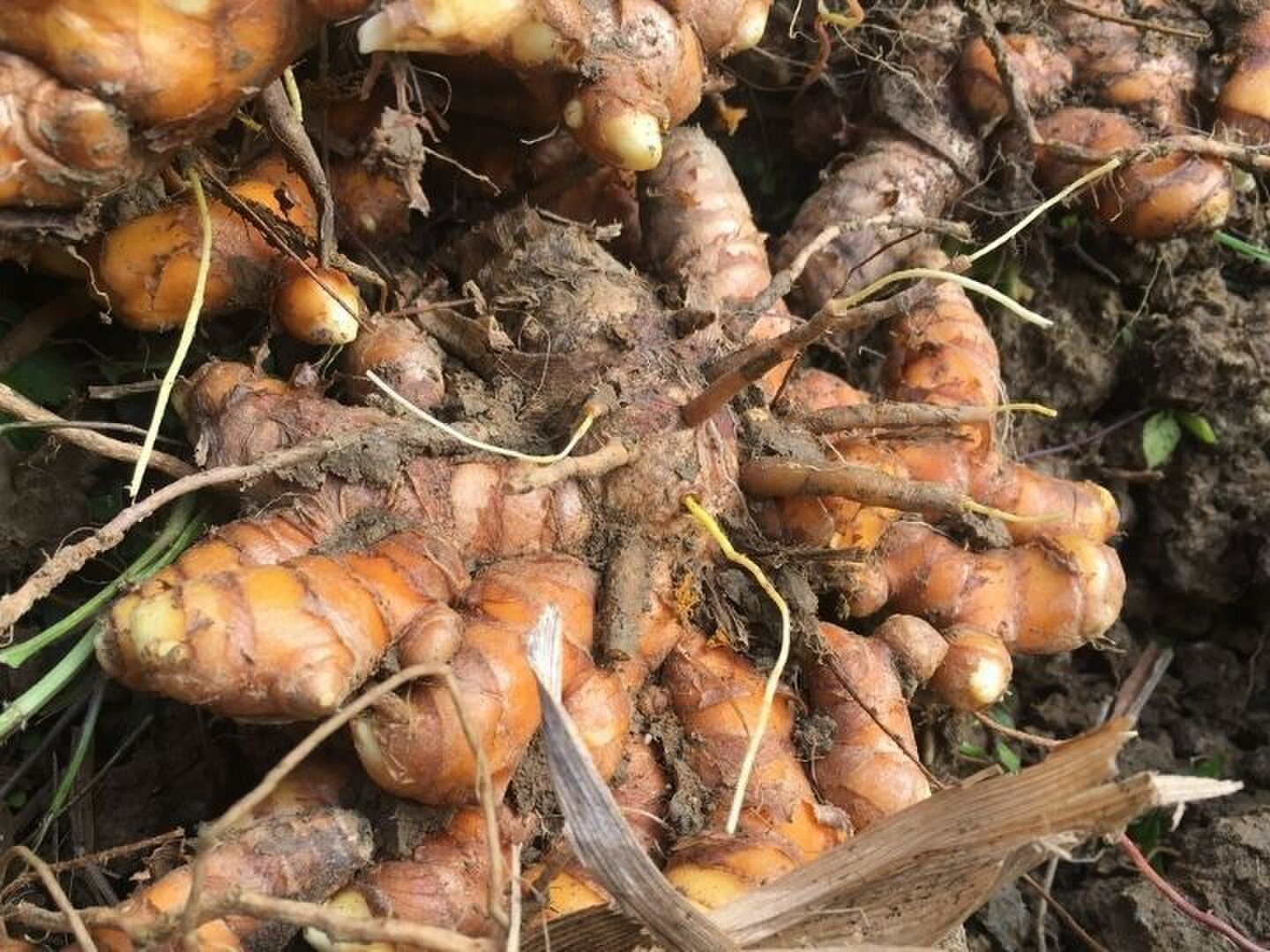 生の根茎は鮮やかなオレンジで、クルクミンが特徴的な成分です。カレーに使われる有名なスパイスです。