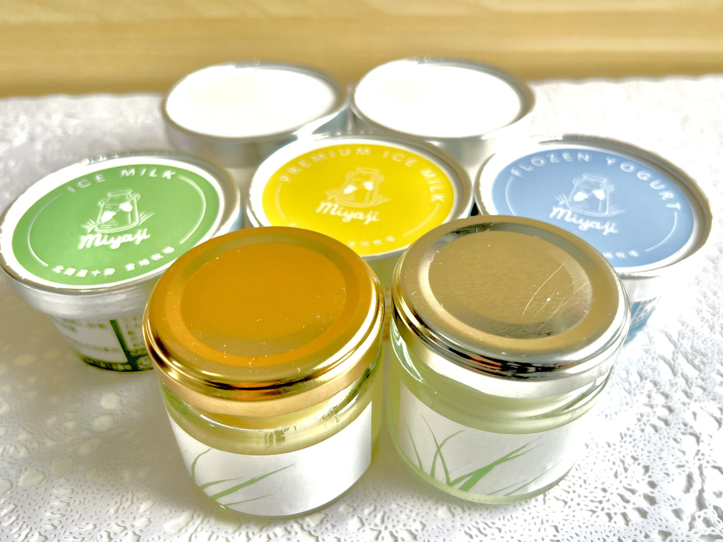 宮地牧場のグラスフェッドミルク(牧草のみで育てた牛から搾られたミルク)を原料としたグラスフェッドバターのハーフタイプ50g1個とグラスフェッドフロマージュブランのハーフタイプ60g1個。アイスミルク1個,プレミアムアイスミルク1個,フローズンヨーグルト1個,試作フローズンヨーグルト2個のセット