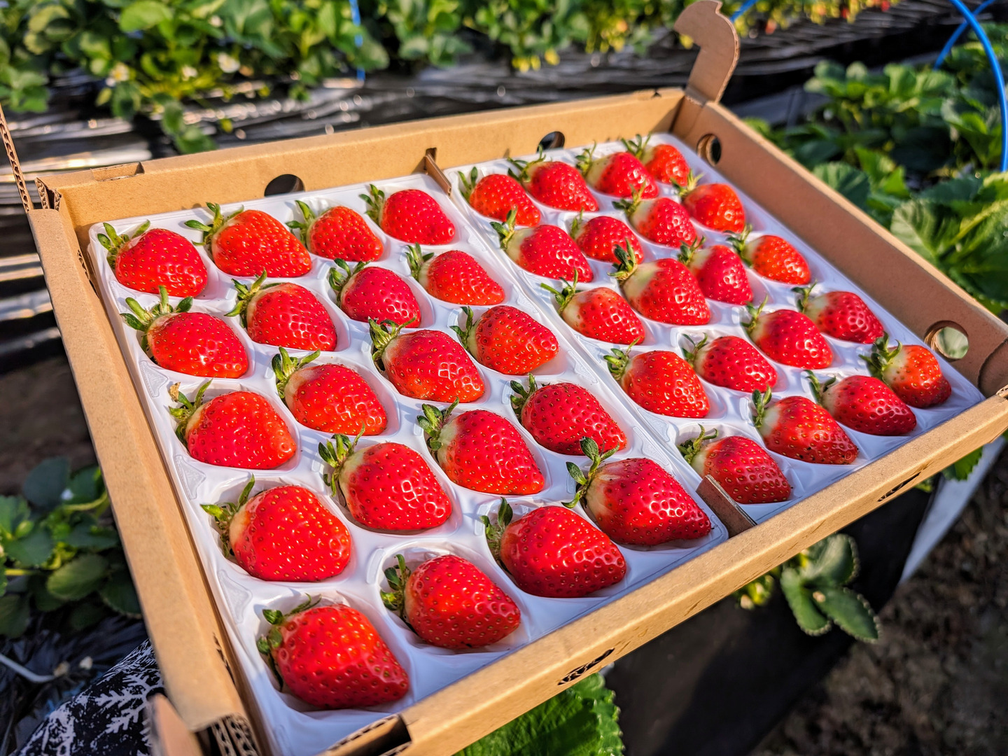 発送当日朝7時までに収穫した、完熟イチゴのMサイズを(1粒14g前後)1箱約600gお送りします