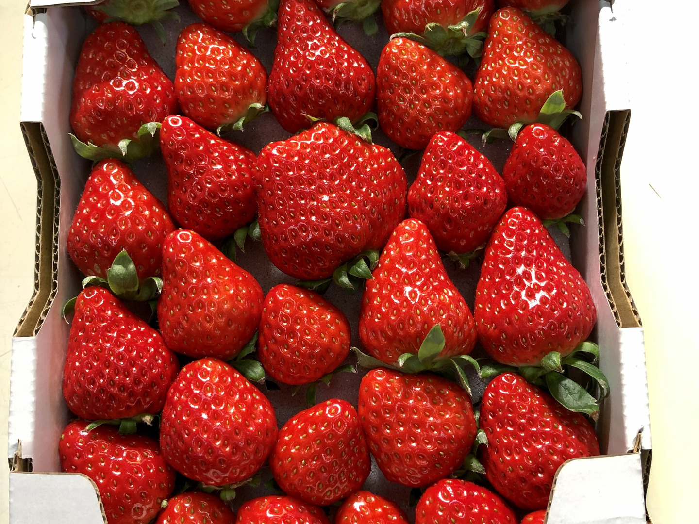 ☆その日に収穫できたいちごにより、大きさにバラつきが出ますが、M〜3Lサイズまでの大きさ色々を箱に、2段にバラ詰めします。