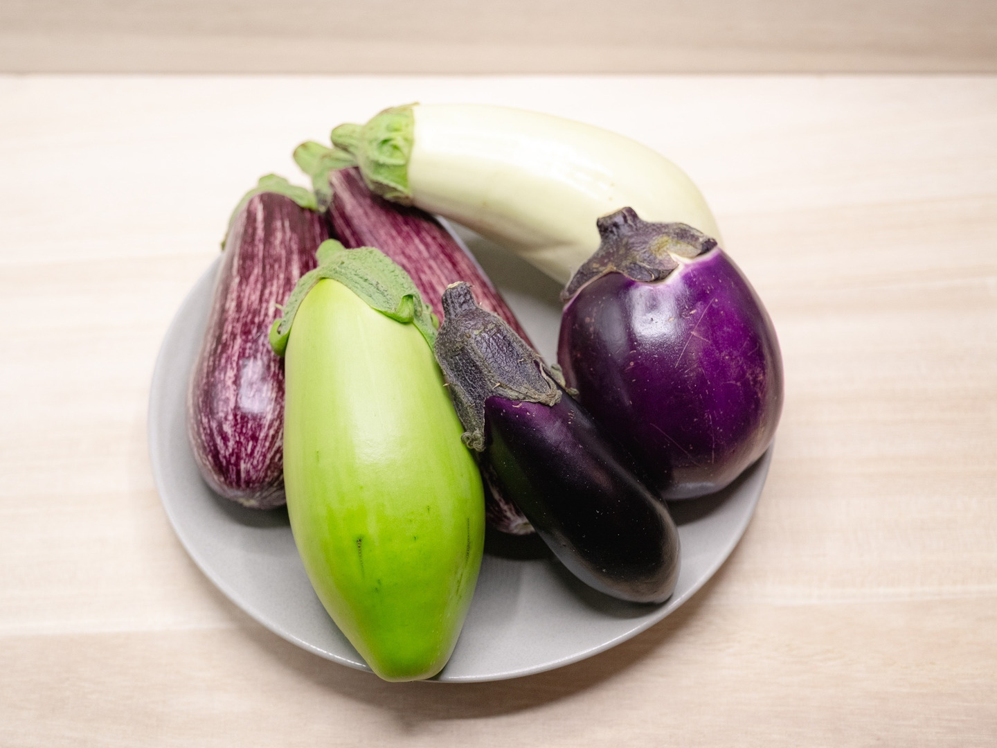 イタリア品種の白ナス。緑、ゼブラ、丸ナスです。